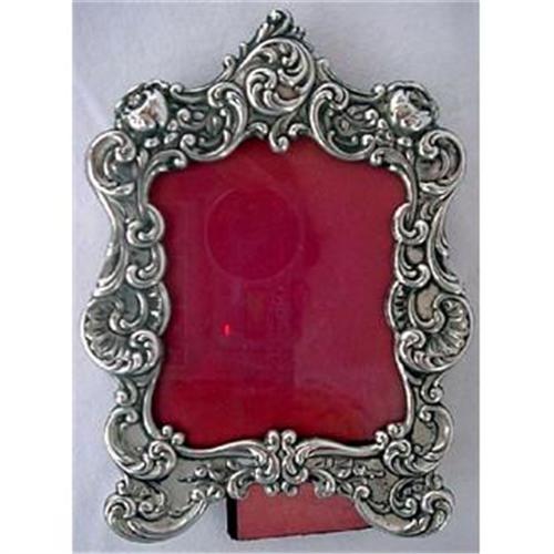 19th century Art Nouveau sterling silver picture/photograph frame, made by the Gorham company. Measures 5 1/4inches high and 3 1/4inches wide. Stand alone frame. The back is covered with a deep plum coloured velvet which may be original. The frame itself in beautiful repousse silver with scrolls and roses on the top two corners. The center is a rolling wave, very ornate. Great quality and workmanship. Engraved mark on the side reads GORHAM STERLING 321. No dings/dents. Please note: I have another identical frame with green backing. Please enquire.