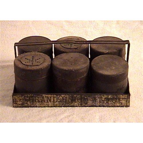 This is a wonderful 1860s tin spice set found in Maine. The set has an original tin holding tray and on both sides on japanned tin it reads Grand Union Tea Co in black stenciled letters. The rack has a carrying handle and holds 6 different spice containers and shakers. The tins were also marked but only three still have stenciled lettering they read cloves, peppers, and most of allspice. Two of the containers have spinning shaker tops on them the rest have pull off lids. The set is complete and all original. It measures 8 x 5.5 x 4 inches. The set shows some use wear especially the finish, it is solid and complete and I think pretty amazing to find it complete.