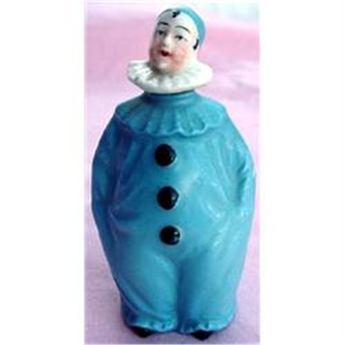 19th century miniature porcelain scent / perfume bottle in the form of a clown. Probably made in Germany. Measues 2 3/4inches high. The little person stands in a bulky blue clown suit. Ruffles at the neck and big black buttons over the belly. Little black shoes point out from under the frilly trousers. Around the neck is a white frilly collar and there is a blue cap on the head, from under which a few black curls escape. Beautiful facial features, bow lips and rosy cheeks hint that this may be a woman and not a man. Great condition: no chips/cracks or damage of any sort.