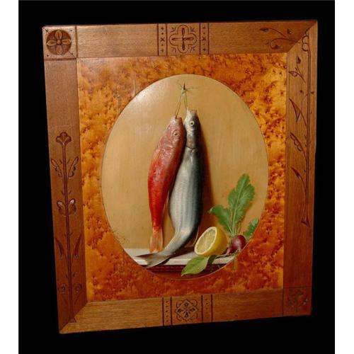 Signed O. Costa. 1873 lower left, highly detailed and colorful realist depiction of a pair of freshly caught fish strung up besides a cut lemon and several radishes on a counter top. The painting is housed in its original arts and crafts oak wood frame, the inner wood is made out of birch with the original "Costa & Conti" gallery label on the verso. This painting would make a superb addition to any fine household or collection. ****NOTE: Email for more images.