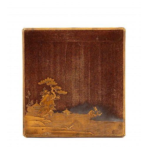 19th Century Japanese Makie Lacquer Writing Box <p> It is 1.5 inches tall and 8.9 inches by 8.3 inches wide. </p><p> It is in good condition with no repairs, except a crack of 6.5 inches in length at the center, small cracks and peeling at the corner, and small chips at the edge of the lid. The lid also has surface wear and small dents. Small cracks and peeling at the bottom (all as seen in the photos). </p>