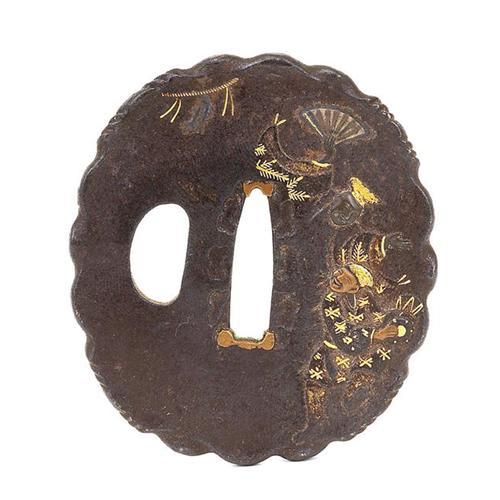 <tr><td>Title:19C Japanese Tsuba Iron Mix Metal w Dancer</td></tr>