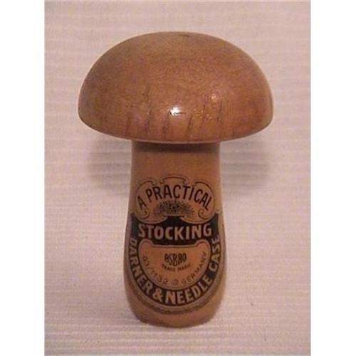 This is a wonderful antique sewing collectible and not easy to find. It is a fine blonde wood darner and needle case combination. It reads in black letters A Practical Stocking Darner & Needle Case Asbro Germany. You twist the tightly fitted mushroom cap off and there is the needle case. It measures 4 x 2.25 inches. There is some use wear to the top of the darner overall in very good condition. We have a collection of sewing related items in the store so take a look. <p>Shipping and insurance are determined after checkout. <p>