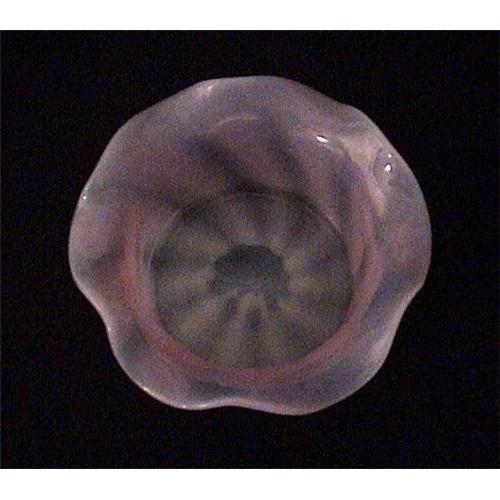This is a very unusual and beautiful piece of Victorian blown art glass. It is a gorgeous color an opalescent pink with a lighter and darker stripe design. It has a ruffled edge and a nice ground pontil on the bottom. It measures 5 x 2.25 inches. It is in excellent no damage no flaws condition, a little dirt. <p>Shipping and insurance are determined after checkout. <p>