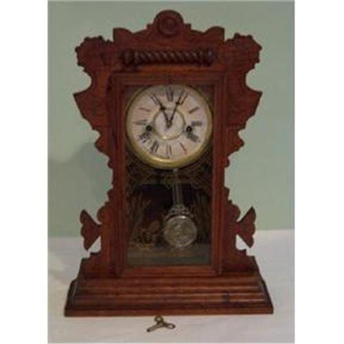Beautiful 19th Century gingerbread clock by the Waterbury Clock Company. When first introduced this style clock was called a "kitchen Clock", and eventually became known as the "Gingerbread Clock". They reached the height of their popularity in middle class Victorian homes in 1880, and were in vogue up until 1900. This clock is the "freehold" model by Waterbury, and is a one day string strike. The clock looks to be completely original with exception of the pendulum. I do not know for sure if it is not original, But it seems to me that it should be gold, not silver. The pendulum is old and of the right age, and has a sculptured head of a soldier with metal helmet. The original glass door is decorated with gold crane's in a pond among cattails. The case is in very good condition with no cracks. The finish is very nice. The clock does work and comes with it's key. The measurements are; 21 1/2" tall and 15" wide. The original paper label is on the back, and is legible, though somewhat stained.