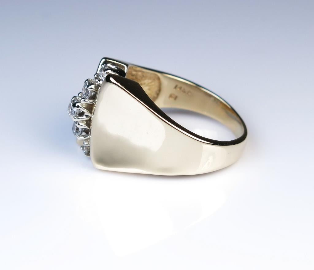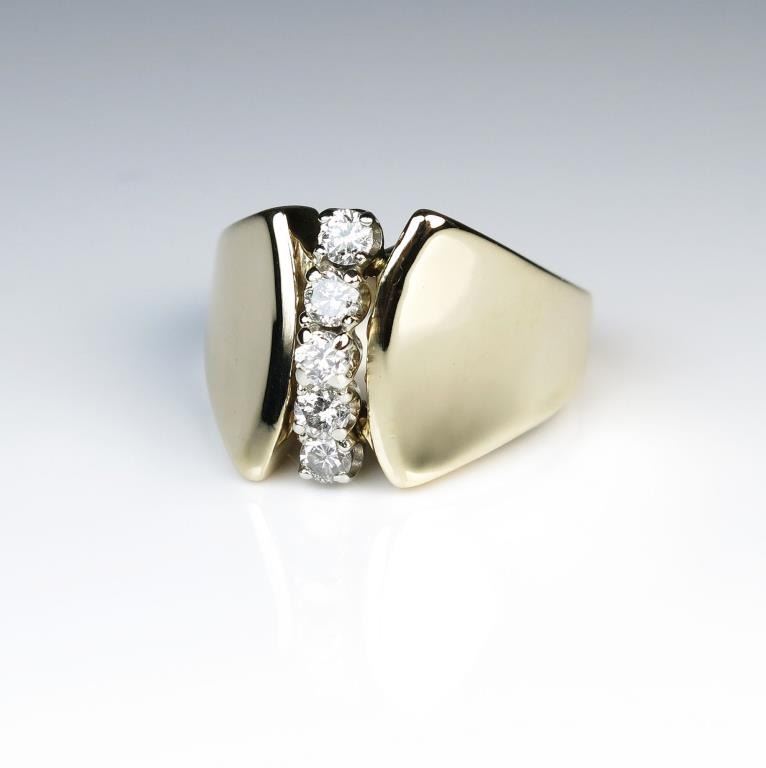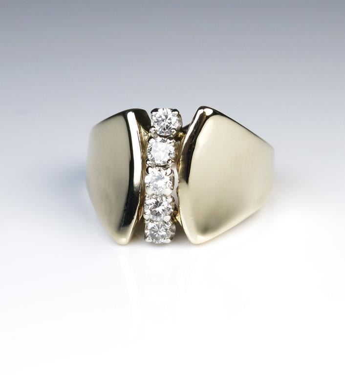 Contemporary Diamond Ring featuring 5 round cut Diamonds approx. 0.30 carat with H-I colors and SI clarity set in 14 karat yellow gold. Retail $2,000-$2,500 Estimates $1,000-$1,500