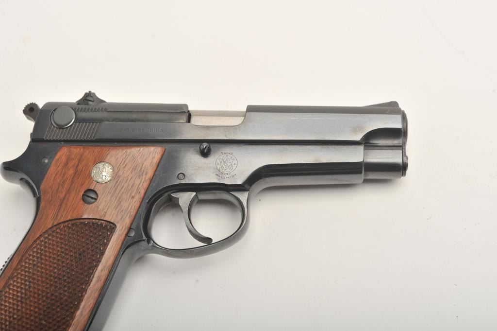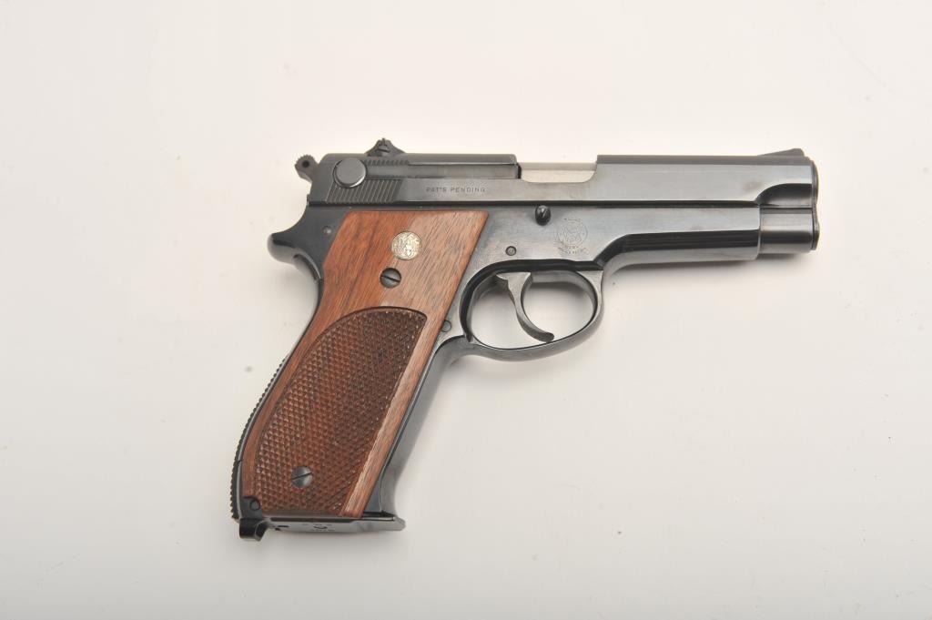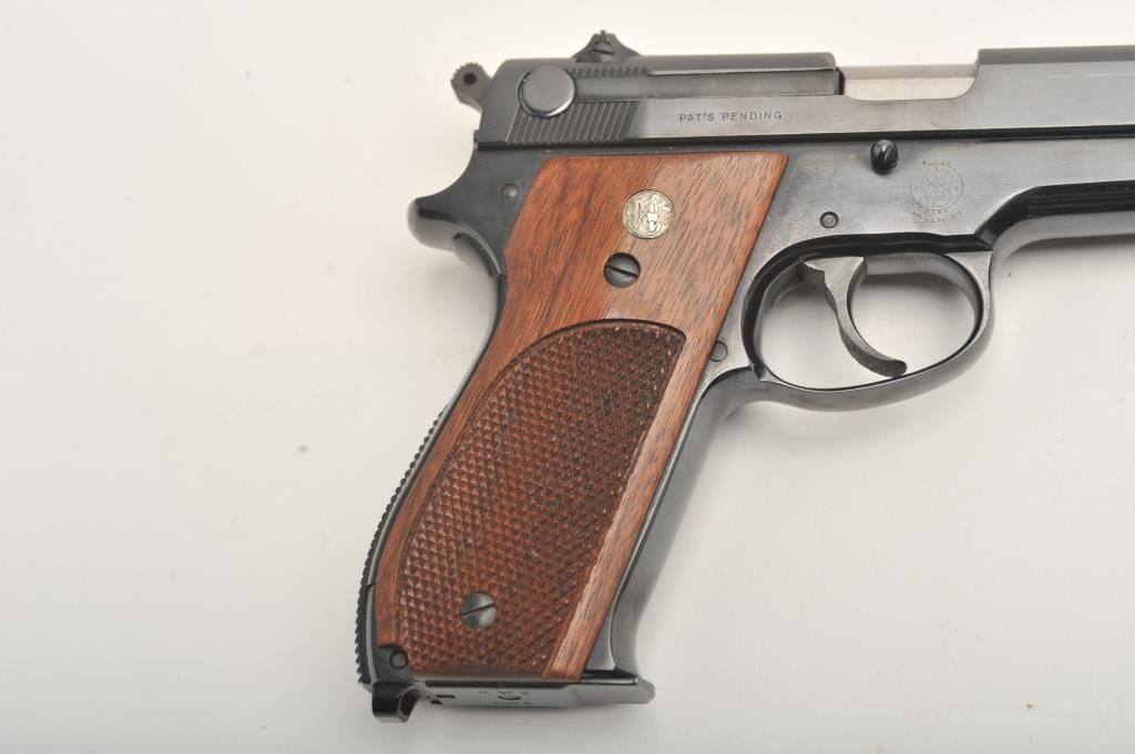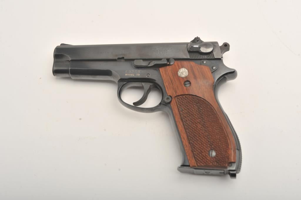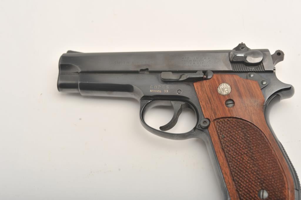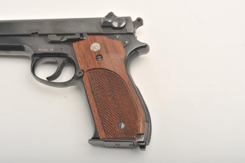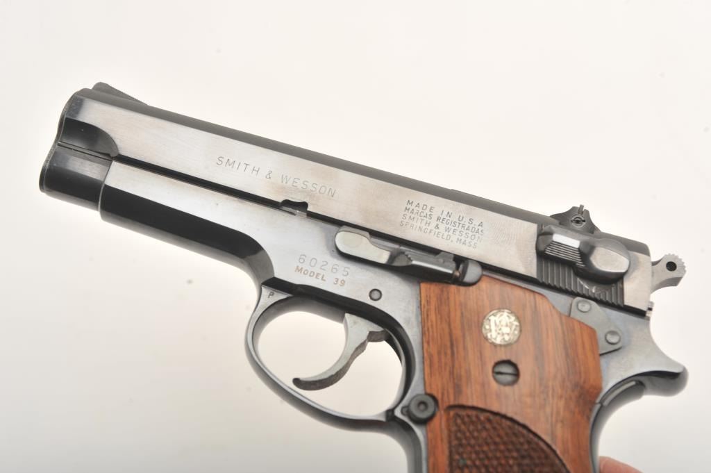 Early Smith & Wesson 39 steel frame, #60265, 4" barrel, blued barrel, blued finish, smooth front strap, adjustable sights, checkered logo grips, lanyard loop. Pistol is in fine to near excellent condtion, retaining approximately 96-98% original finish, with minor lateral scratches on the slide and right side of the frame which do not go through the finish. Includes one correct mag. There were 927 steel frame model 39s made during three production runs. This is one of the first 100, and a fine example. (Modern/PPT) Est. $900-1800