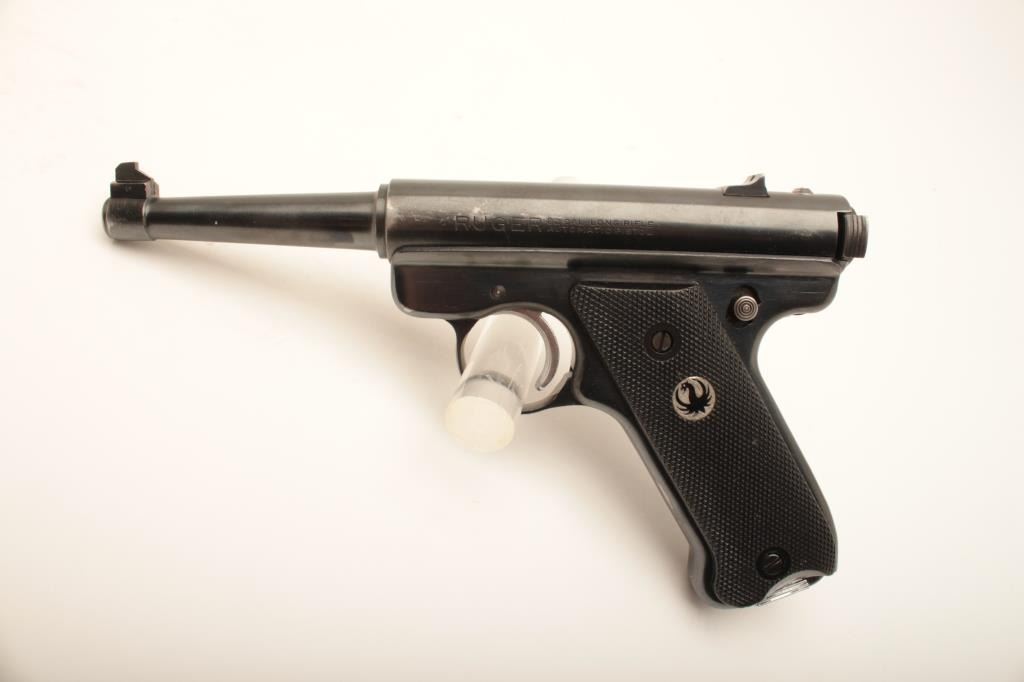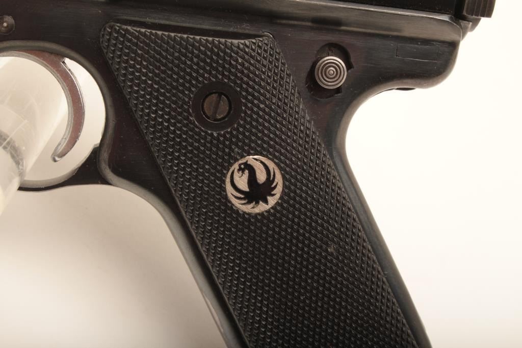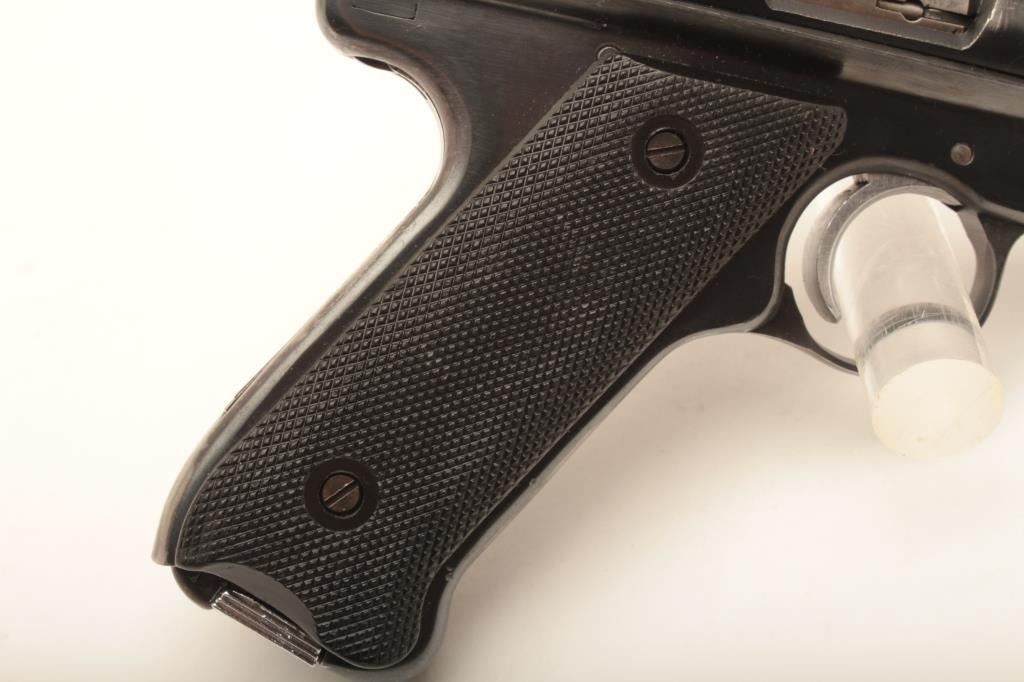 Ruger Standard Automatic Pistol, #57070, 9mm, 4 3/4" tapered barrel, blued finish, Eropean mag release, plastic checkered logo grips. Pistol is in very good to fine condition overall, showing some finish wear, mainly on the sharp edges and side of the receiver. Very good bore, good action, very good grips. One mag. (Modern/PPT) Est. $125-250.