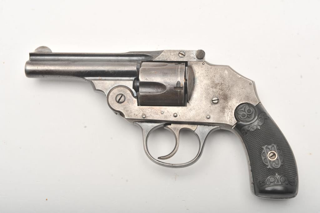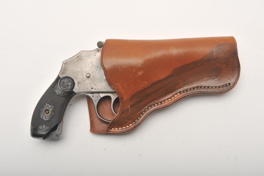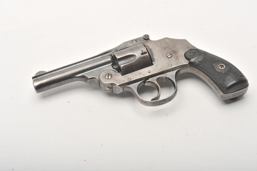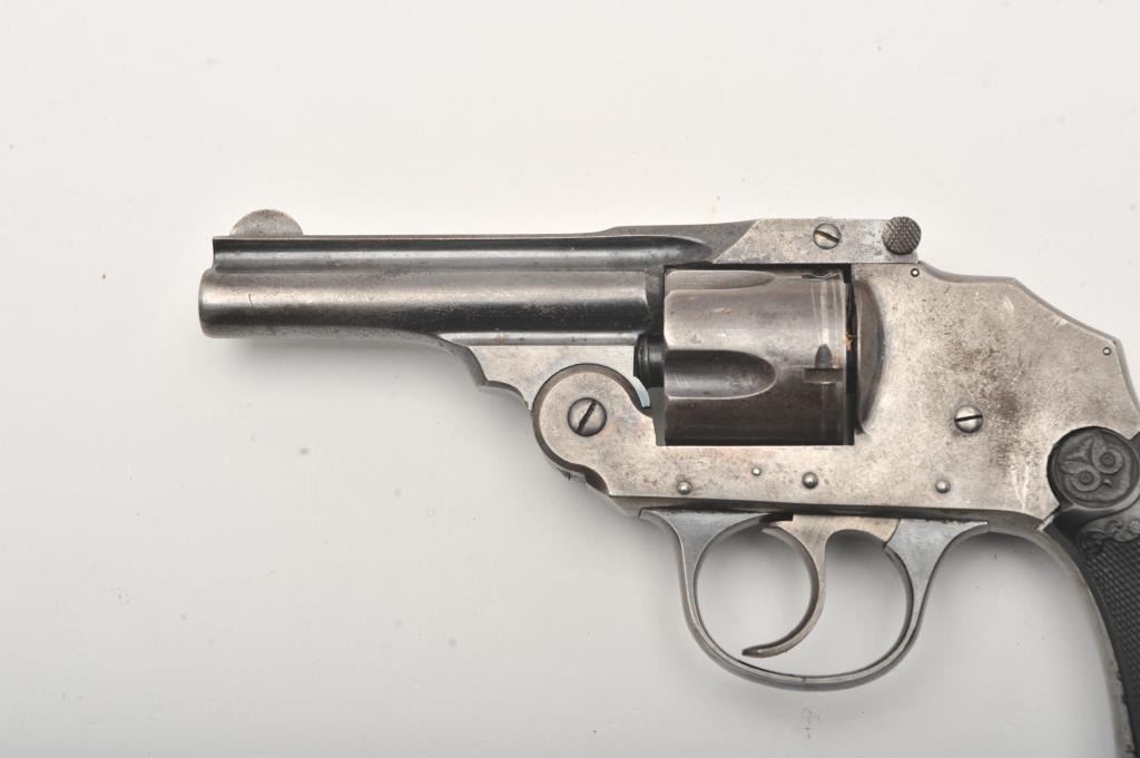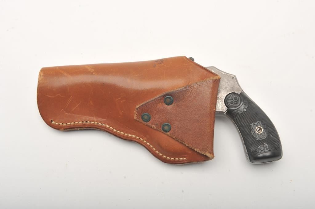 Iver Johnson Safety Hammerless revolver, .38 caliber, Serial #2563. The pistol is in good overall condition with a 3 ¼” barrel. The barrel retains a significant amount of thinning blue finish with the frame and cylinder going to a grey patina. The checkered hard rubber grips are in fair condition with a large chip missing from the base of the right panel. The bore is fair, the action functions and the markings are legible. The lot includes a leather, open-top belt holster. Est.: $100-$200. (C+R/PPT).