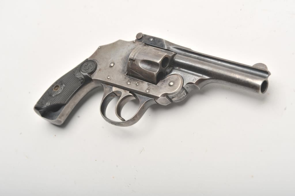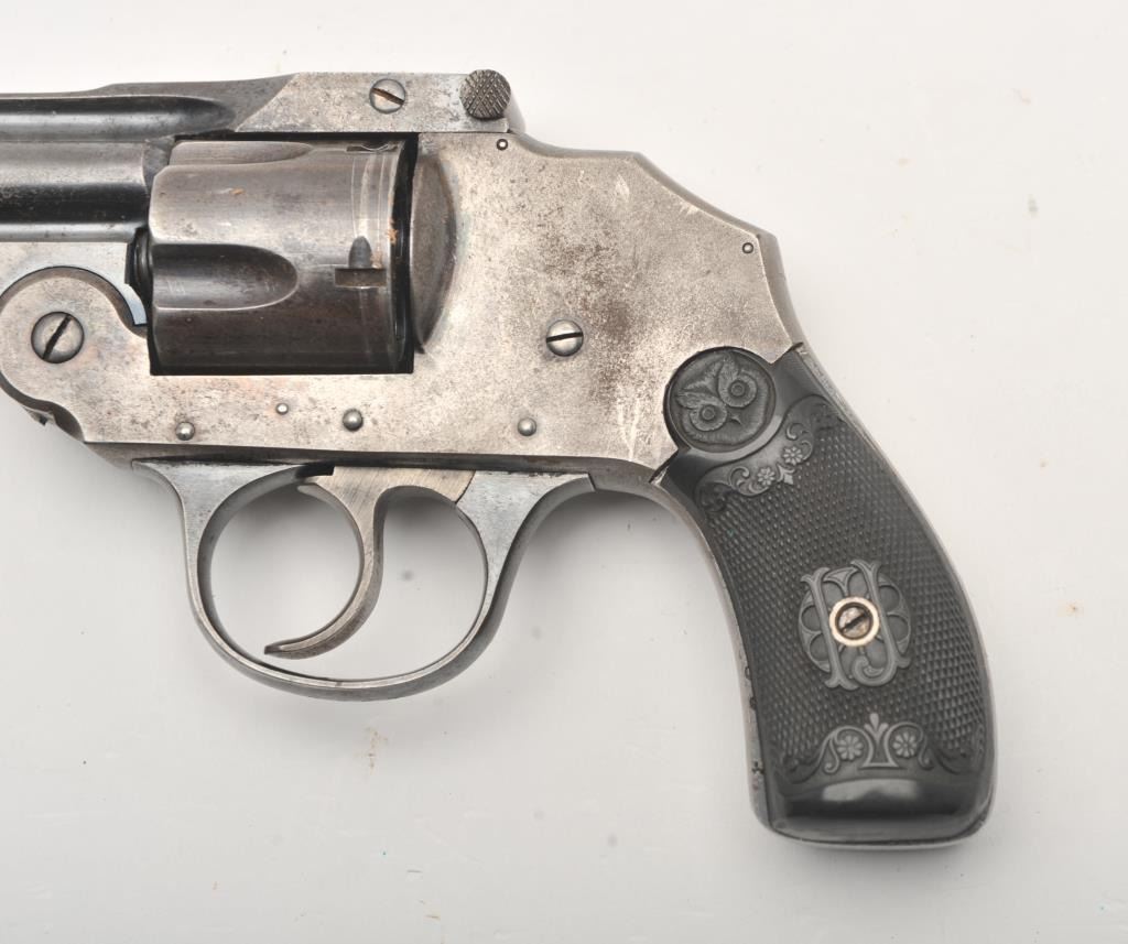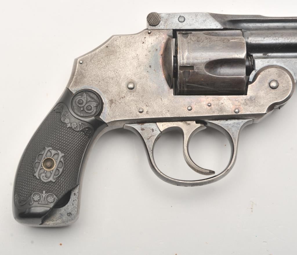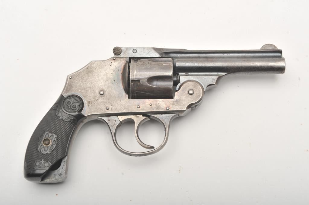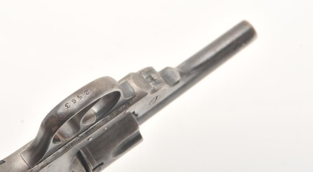 Iver Johnson Safety Hammerless revolver, .38 caliber, Serial #2563. The pistol is in good overall condition with a 3 ¼” barrel. The barrel retains a significant amount of thinning blue finish with the frame and cylinder going to a grey patina. The checkered hard rubber grips are in fair condition with a large chip missing from the base of the right panel. The bore is fair, the action functions and the markings are legible. The lot includes a leather, open-top belt holster. Est.: $100-$200. (C+R/PPT).