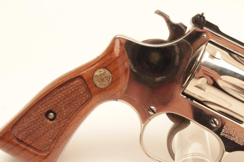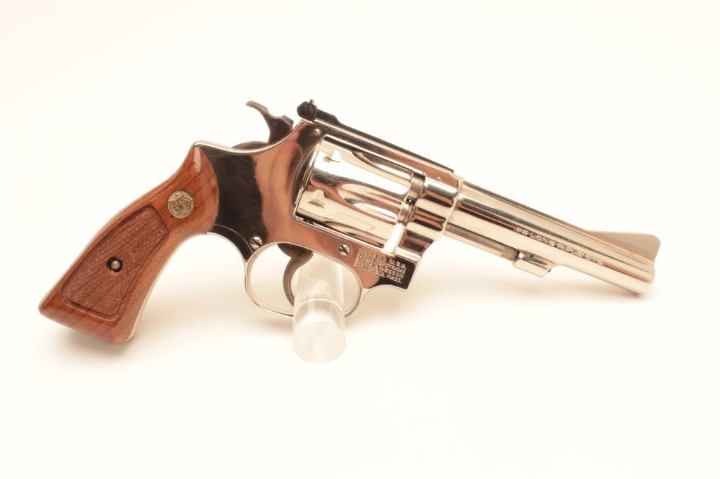 Smith & Wesson Model 34-1 DA revolver, .22LR caliber, 4” barrel, nickel finish, checkered wood medallion grips, S/N M131841; overall like new condition with factory two piece silver and blue cardboard box, instructions, cleaning tool and detached end label numbered to this gun. (Modern/NO CAL. SALE). Est.: $500-$1,000.