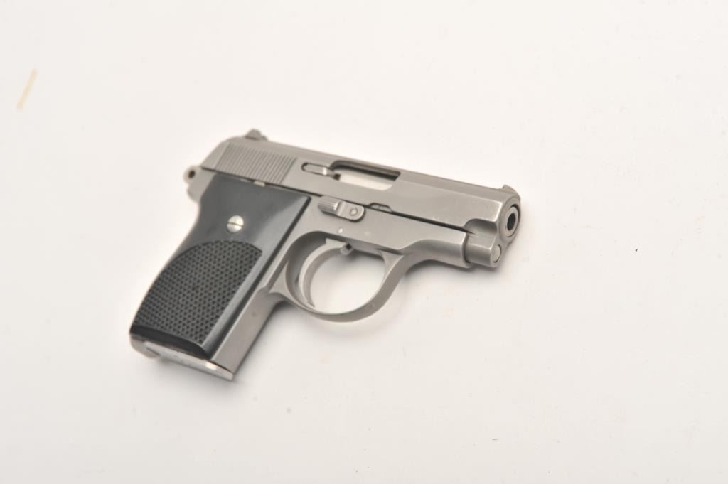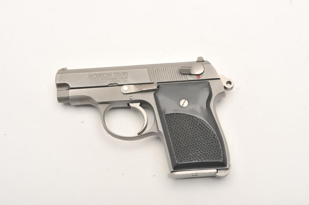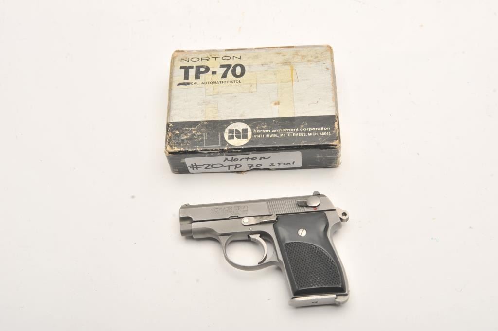 Norton TP-70 #645, .25 cal., 2 5/8" barrel,  stanless, fixed sights, black checkered  plastic grips.  Pistol is in very good  condition overall, showing some scratches  from use, good bore, high point edge wear, very good grips.  Includes original box and  one mag.  (Modern/PPT)  Est. $200-400