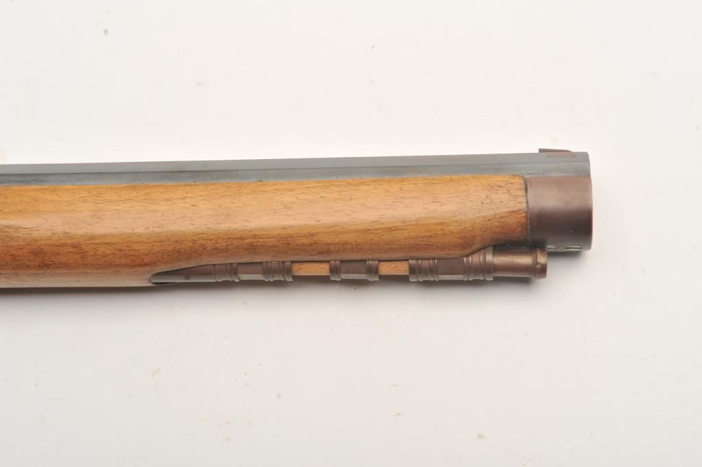 Reproduction single shot percussion pistol, approximately .45 caliber, Serial #1255. The pistol is in very good overall condition with a 10” octagon barrel marked, “MADE IN SPAIN”. The barrel retains the majority of its blue finish with an engraved brass side plate marked, “STEPHEN H. ANDERSON”. The checkered wood stocks are in very good condition with sharp checkering. Est.: $100-$200.