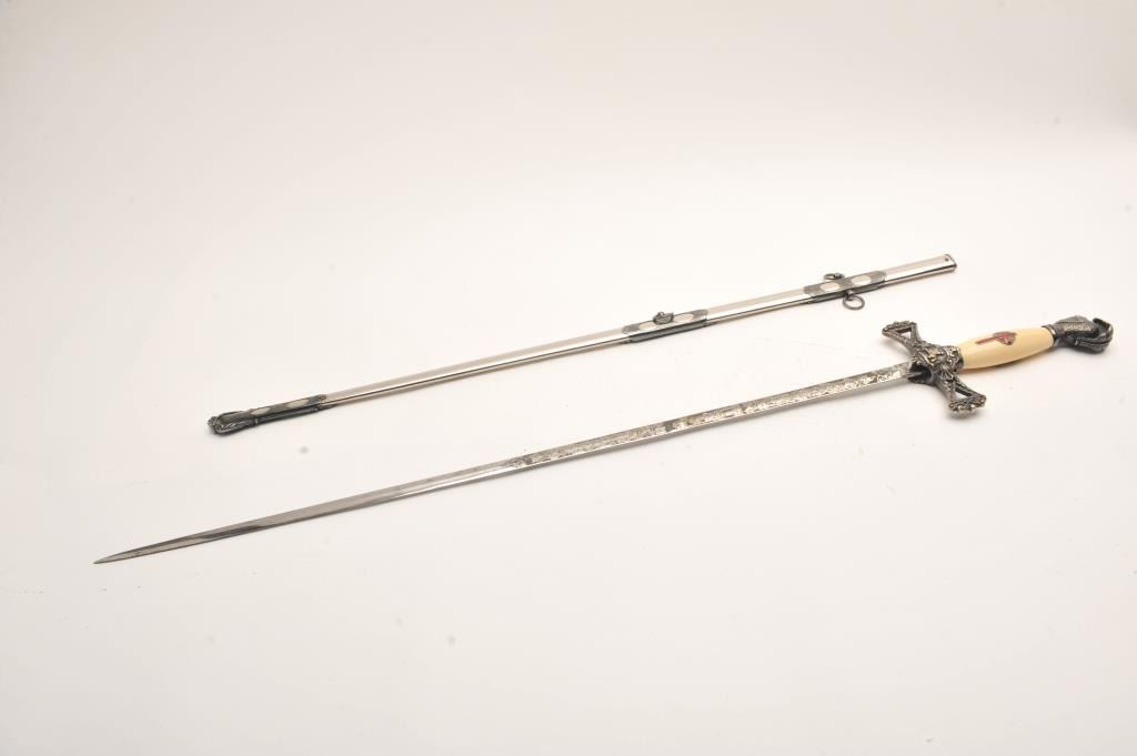 A nearly mint Knights Templar fraternal sword by Horstman, Philadelphia, much fancier than usually encountered with etched and gilt blade to William Bart, and fine silvered mounts depicting knights in armor. Scrimshawed ivory (?) grip. The best one of these we have offered. Est: 300-500