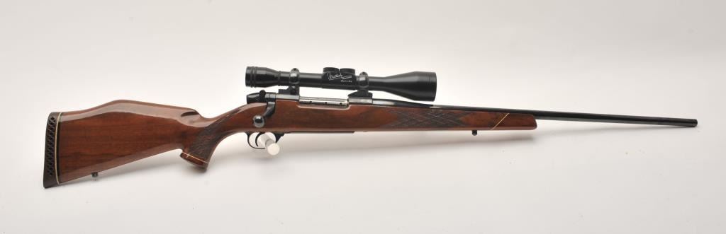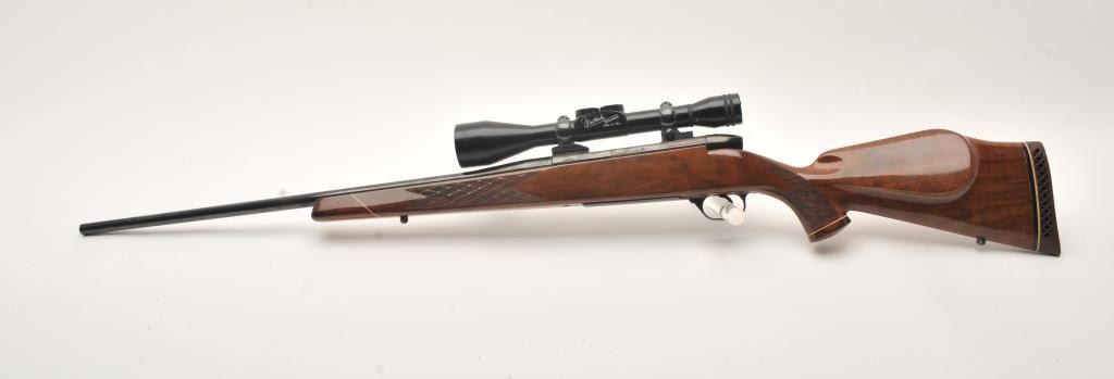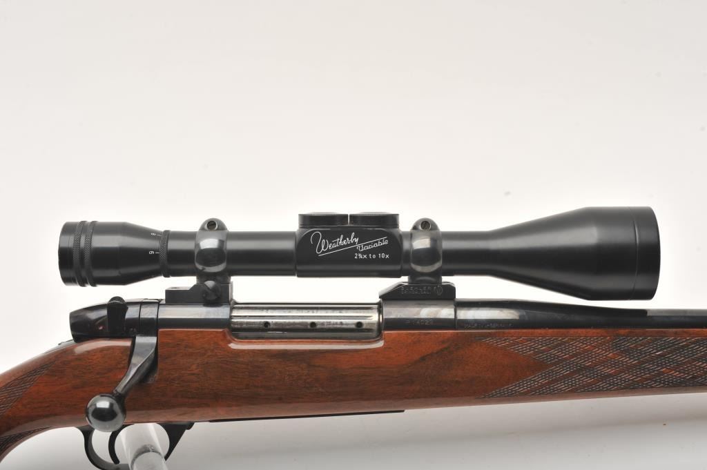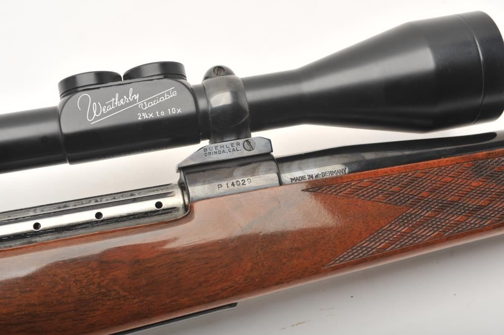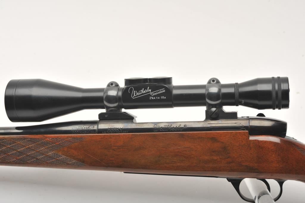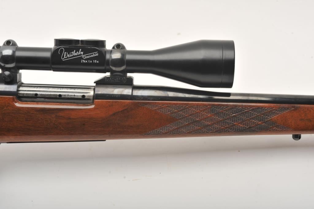 Weatherby Mark V, #P14029, .300 Wby Mag cal., blued finish, checkered walnut stock with Weatherby variable 2 3/4-10x scope. Rifle is in near fine condition overall, retaining approximately 95-97% original finish, very good bore, stock is very good with some light checking of the varnish, recoil pad is hard. Scope is good with good optics. Made in W. Germany. (Modern/PPT) Est. $800-1600