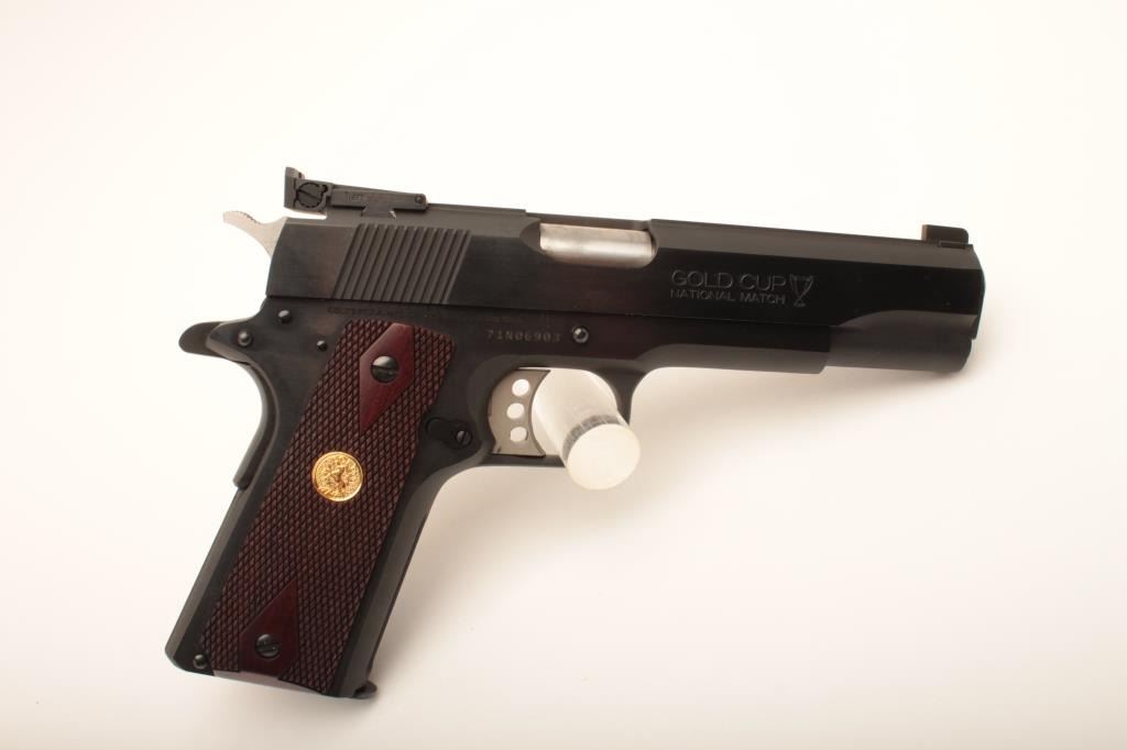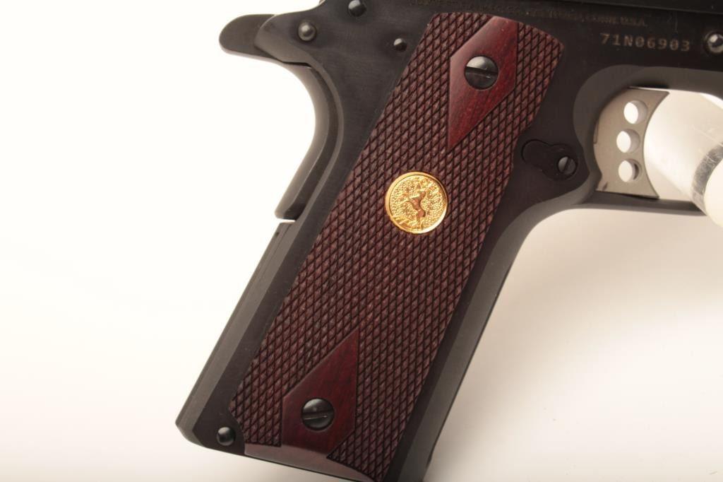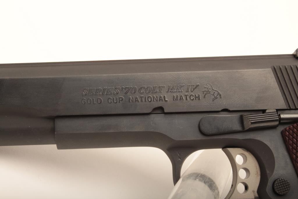 Colt Series 70 Gold Cup National Match, #71N06903, .45 ACP cal., 5" barrel., blued finish, adjustable sights, checkered medallion grips. Pistol is in near fine condition overall, retaining 96-98% original finish, bore is very good, action is very good, grips are fine. Includes original box, manual, 2 mags and OEM lock. (Modern/PPT) Est. $900-1800