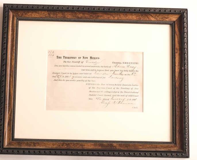 Framed and matted Territory of New Mexico warrant for Adam Casey to the Sheriff of Lincoln County, New Mexico, dated Jan. 13, 1881, an indictment for larceny and executed by Pat F. Garrett on February 7, 1881, signed by him on back as Sheriff of Lincoln County certifying his expenses, sealed and clerk signed for receipt and payment of expenses; approximately 12” x 15” overall. Accompanied by a like framed and matted early map of New Mexico, approximately 26.5” x 20” overall. With this lot is a Certificate of Authenticity from Little John’s Antique Arms and informational letter dated Nov. 9, 1999. A great piece of Western American historywith the warrant being served by Garrett on Billy the Kid approximately 4 months before the Kid was killed by Garrett after his escape from jail. Est.: $1,500-$3,000.