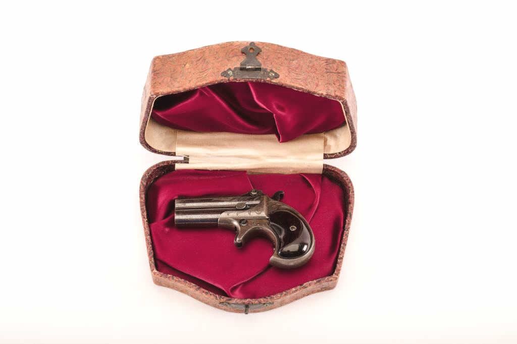 Remington O/U Double Derringer, .41 caliber, 3” barrels, engraved, blued finish, wood grips, S/N 4355; overall very good to near fine condition showing considerable original blued finish remaining on barrels, majorityof muted original niter blued finish on hammer and small parts, crisp action, sharp markings and good bore displaying a couple of spots of erosion; very good to near fine grips. Accompanied by an antique maroon silk lined hard case that is in very good + condition. (Antique). Est.: $1,500-$3,000.