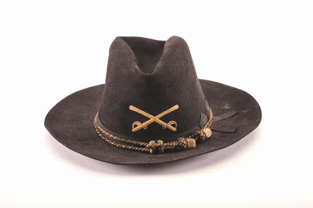 U.S. Cavalry Officer’s hat with crossed sabers and gold cord decoration; overall good condition and marked on sweat band inside “REGULATION U.S. ARMY HAT”. Est.: $350-$700.