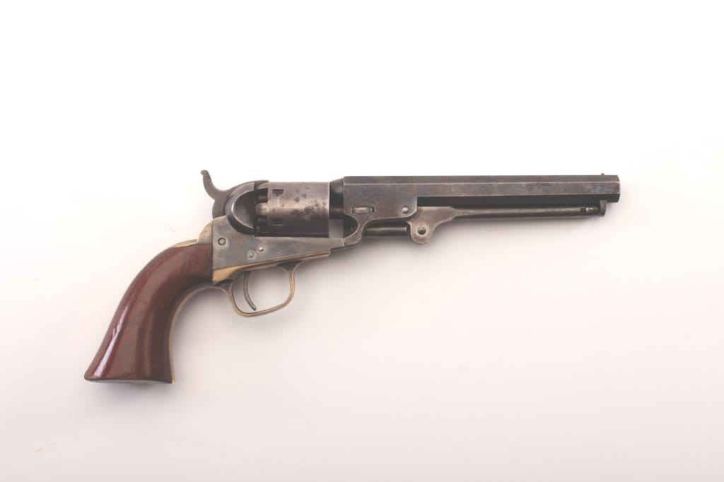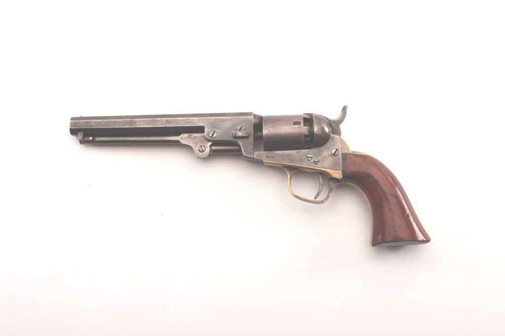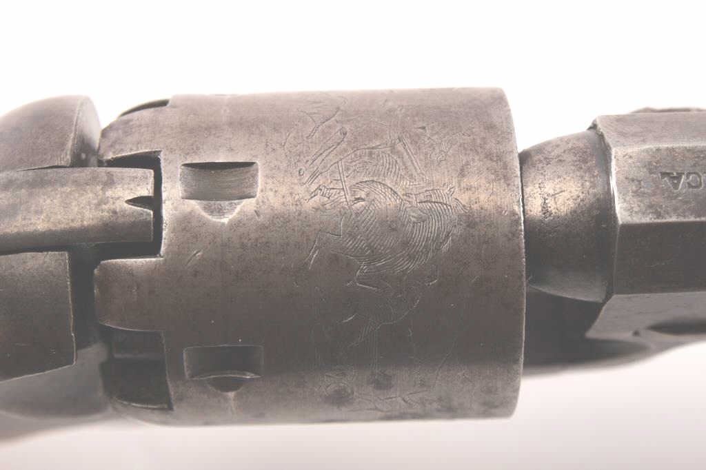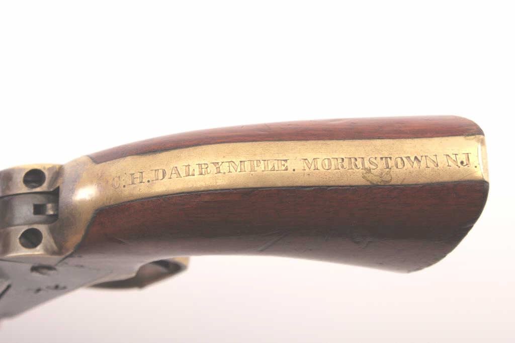 Colt Model 1849 Pocket Model percussion revolver, .31 caliber, 6” octagon barrel, blued and case hardened finish, wood grips, backstrap engraved “C. H. DALRYMPLE, MORRISTOWN, N.J.”, S/N 236542; overallvery good to near fine condition displaying considerable amounts of original blued finish to barrel, majority of cylinder scene remaining and considerable amounts of original case colors to frame and loadinglever; crisp action, sharp markings and very good to near fine wood grips. Accompanied by a typewritten letter describing this Colt and with consignor indication that this gun came to him from his father-in-laws estate(Dr. Robert Dalrymple) and was the Doctor’s Uncle’s firearm, (Charles Hoagland Dalrymple). Inscription in our opinion, is period; additional research on C.H. Dalrymple may prove interesting as the serial numberplaces this gun being made ca. 1863. (Antique). Est.: $1,200-$2,400.