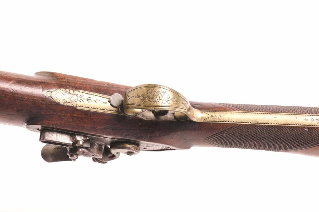 Scotch Coach Guard flintlock blunderbuss marked on top of brass barrel “ST 3083/EDINBURGH”; approximately 30” overall with a 14.5” barrel, brass mounted, brass tipped wood ramrod, checkered wood stock;overall good condition with working action, pleasing patina to brass barrel and mountings; overall good wood stock with an old repair to a sliver of wood on the right side of the fore stock area and scatteredminor old mars and scratches from carry and storage. Accompanied by a typewritten not that describes and includes information on this flintlock including that it was purchased on April 28, 1961 from TheodoreDexter who obtained it from the famous Frank E. Bivans collection. A brass tag numbered “355” is attached to the trigger guard and appears to be the number assigned to this piece in the Bivans collection. Est.:$1,400-$2,800.