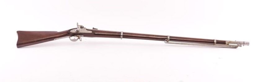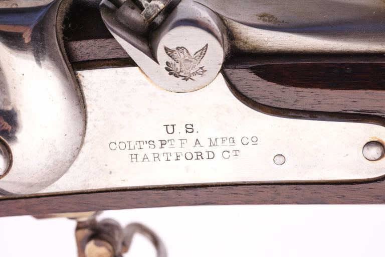 Colt Model U.S. 1861 Special percussion Musket, .58 caliber, 40” barrel, “in the white” finish, wood stock, barrel and lock plate both dated 1864; with bayonet and leather U.S. cartridge box; overall finecondition with metal surfaces retaining their arsenal bright finish with just some scattered light stains here and there and dried grease in protected areas; fine bore, rear sight and trigger are blued and retainmost of that finish. The stock is fine overall with two tiny (1/2”) hairline cracks just to the rear of the lock plate, a couple of tiny dings and the customary light packing crate bruises at the sides of the heel.“AWM” and “JT” cartouches and “EMW” cartouche are sharp. Consignor notes gun was purchased in Sept. 1991, from famed arms expert and dealer, Herb Glass. (Antique). Est.: $1,750-$3,500.