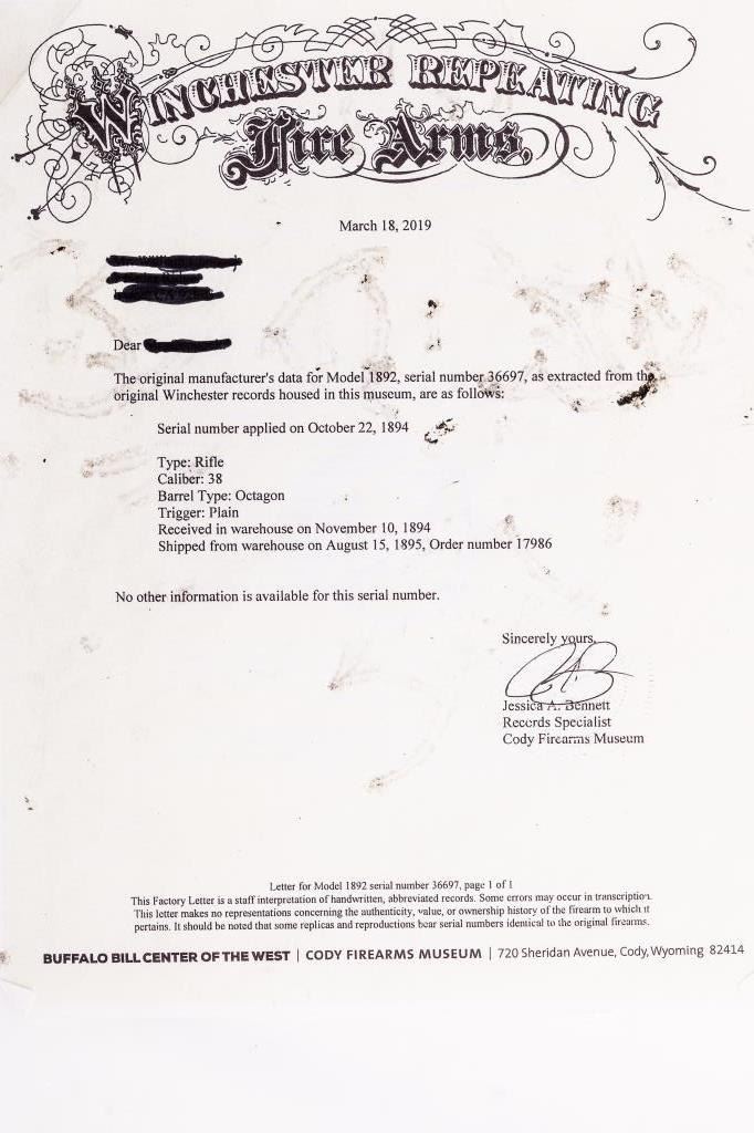 Winchester Model 1892 lever action rifle, .38-40 caliber, 24” octagon barrel, full length magazine, blued finish, wood stocks, rifle butt, S/N 36697 with Xerox copy of a factory letter verifying features, receivedin warehouse on Nov. 10, 1894 and shipped on Aug. 5, 1895 to order number 17986. Good to very good untouched and un-cleaned as found in attic condition; approximately 50-70% toning blue to brown with very good woodshowing minor dings, gouges and imperfections. Sharp overall with a bright bore. A very nice and original early 92! (Antique). Est.: $2,000-$4,000.