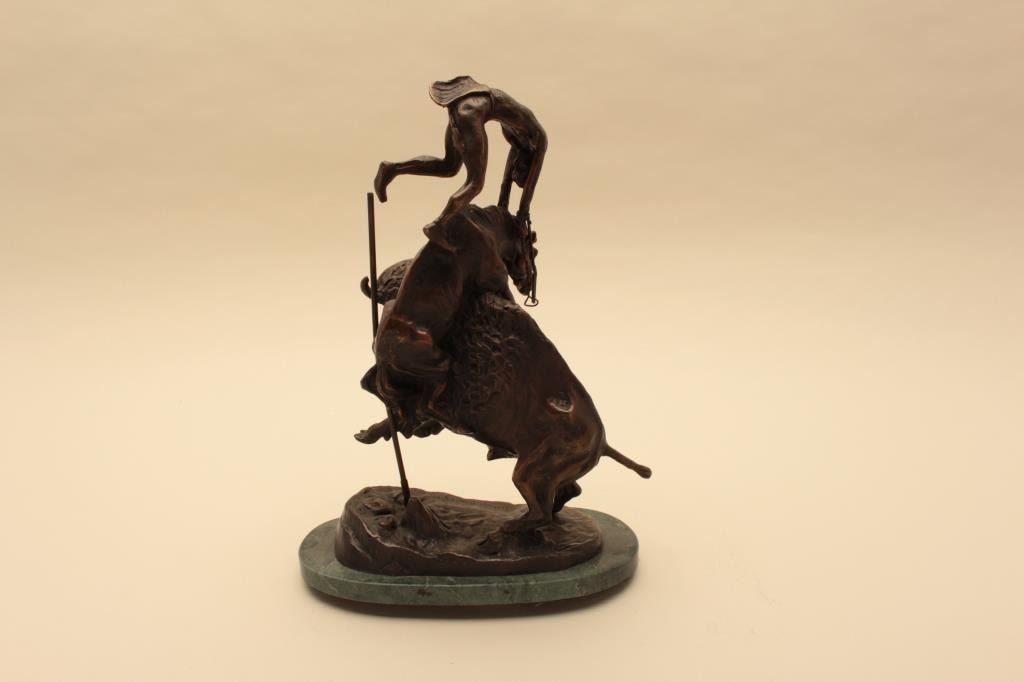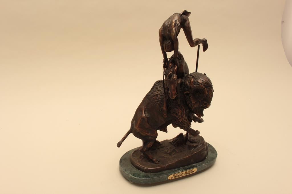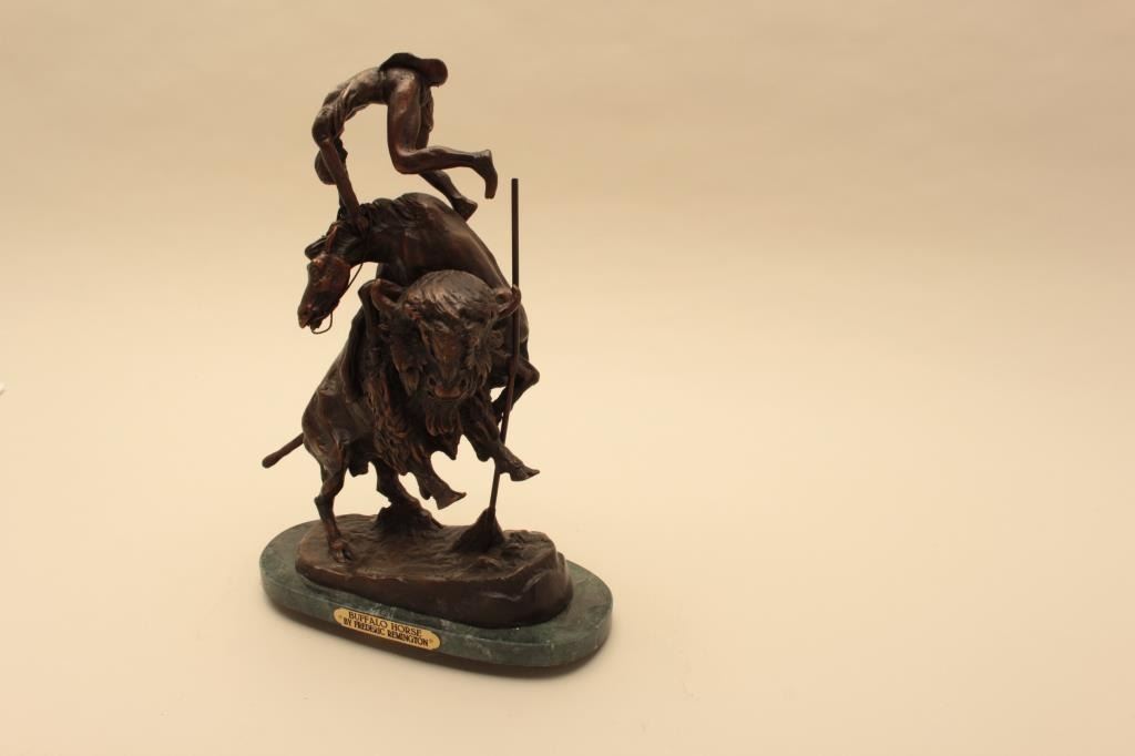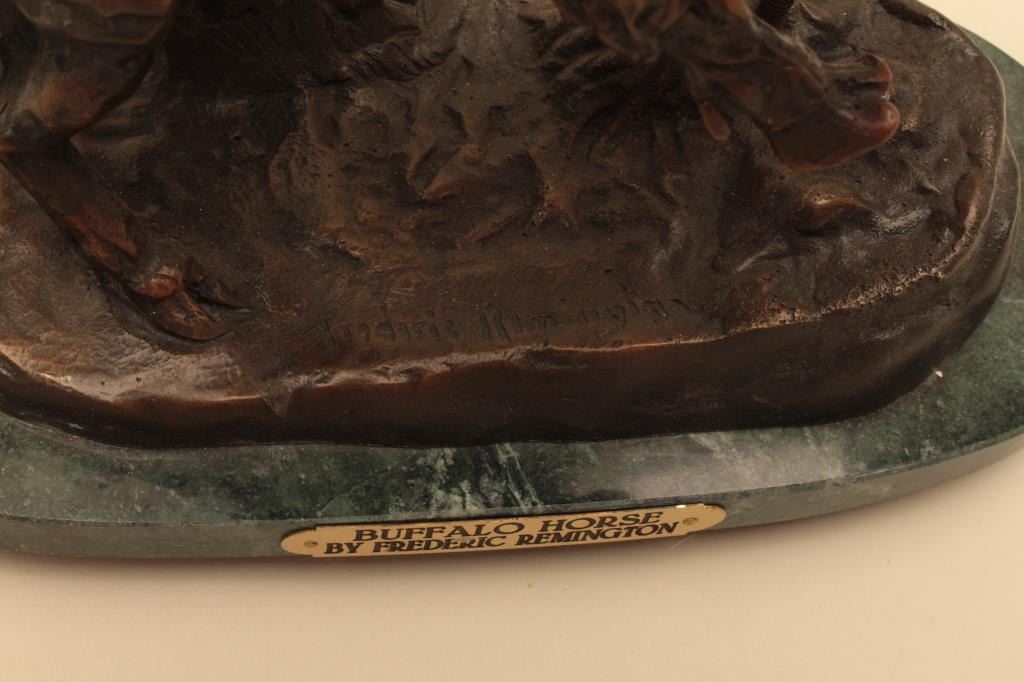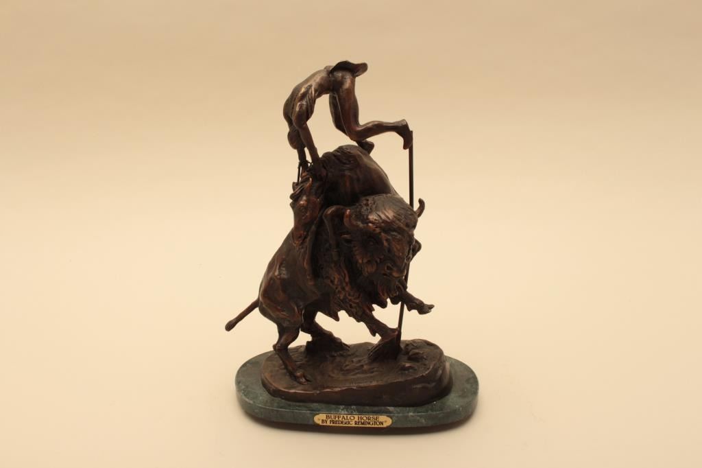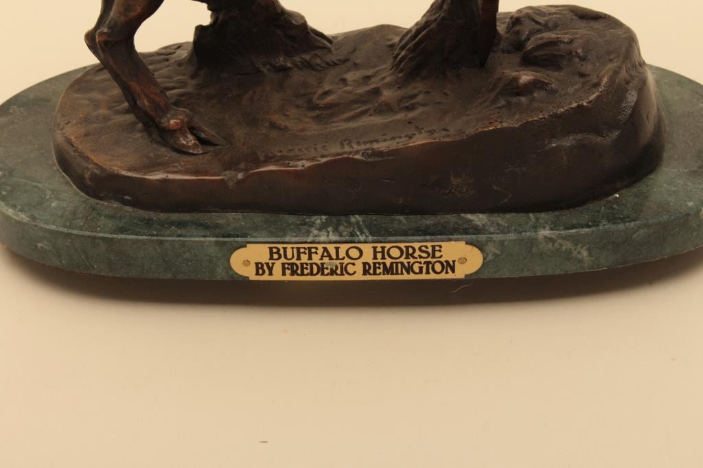 Re-cast bronze by Frederic Remington entitled “Buffalo Horse” on marble base, approximately 16” x 11” x 5”. Est.: $150-$300.