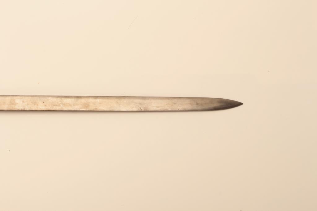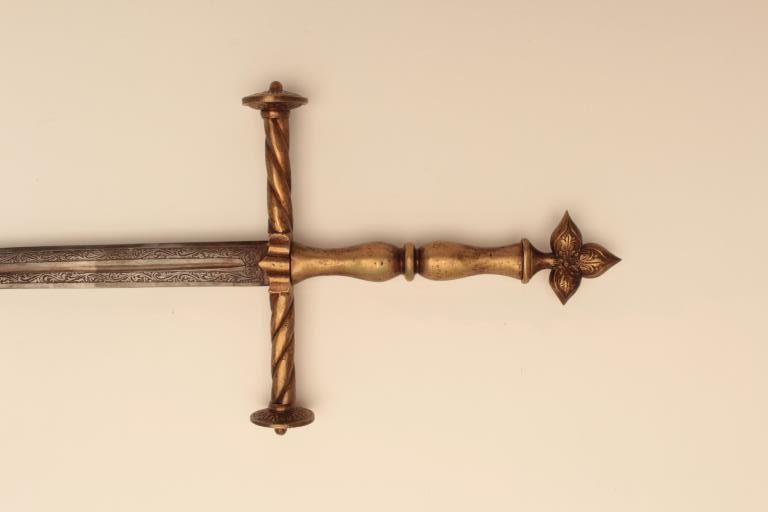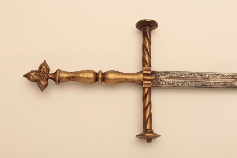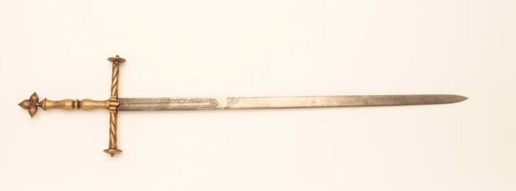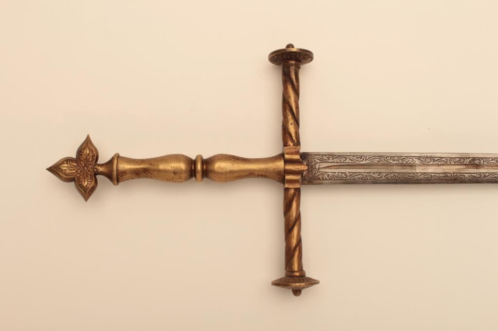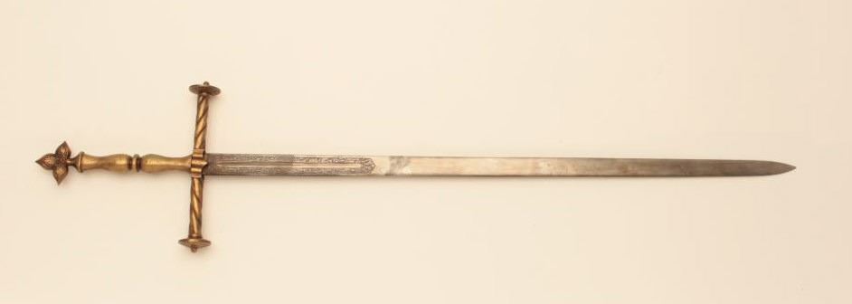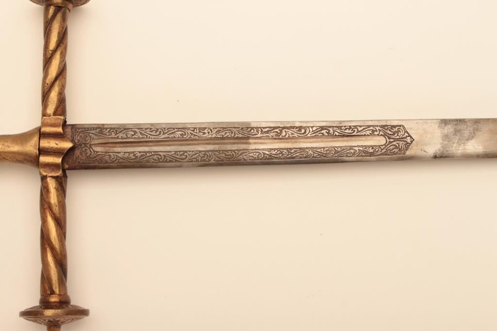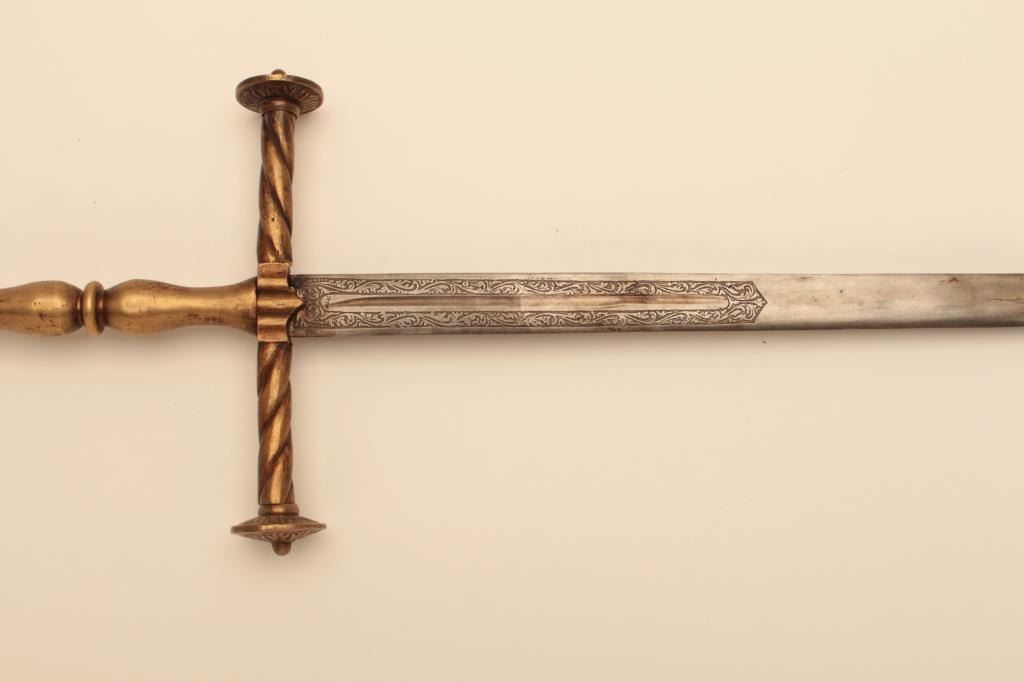 Reproduction Spanish broadsword with some etching to blade and heavy brass cross guard, grip and pommel. Est.: $75-$150.