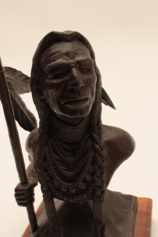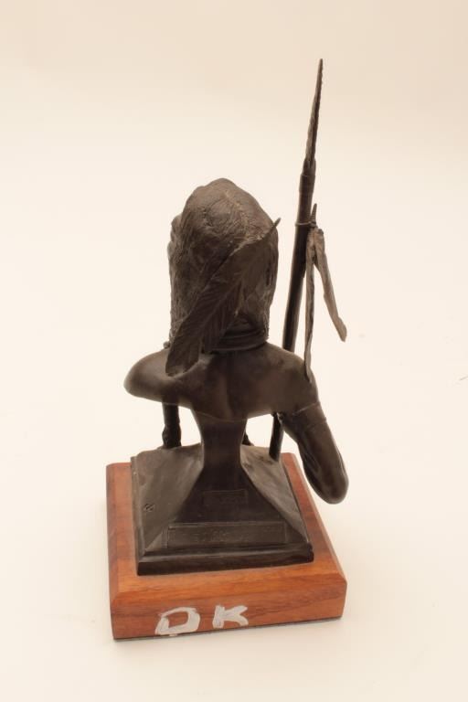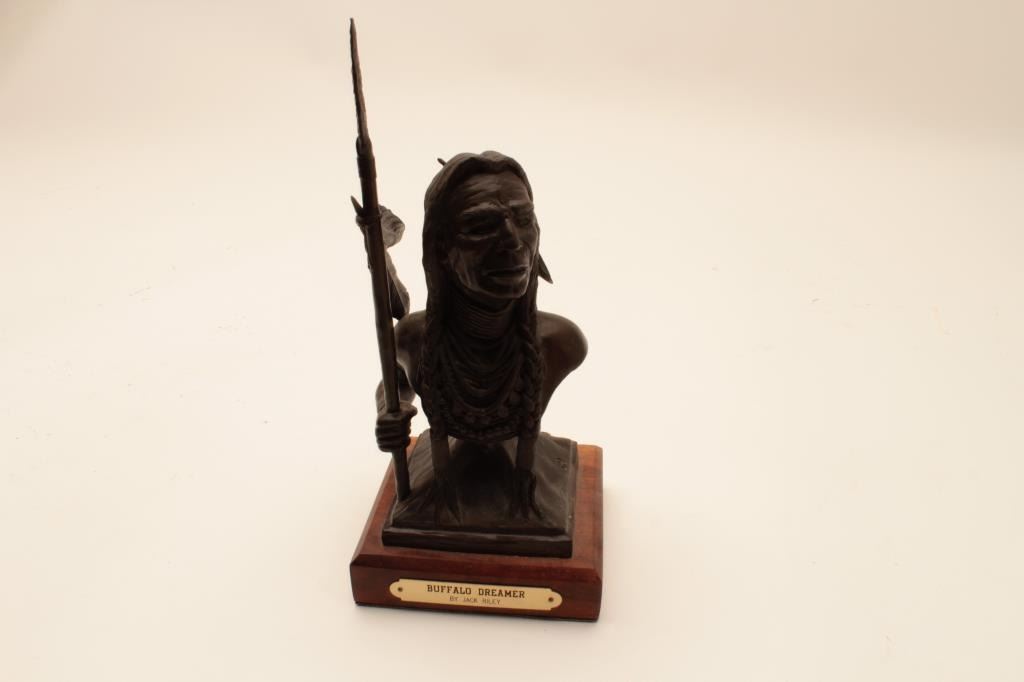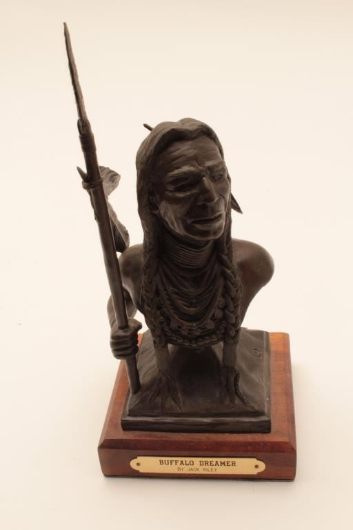 Small bronze on wood base of an Indian with spear entitled “The Buffalo Dreamer” by Jack Riley; approximately 8” x 4” x 4”; nice patina. Est.: $125-$250.
