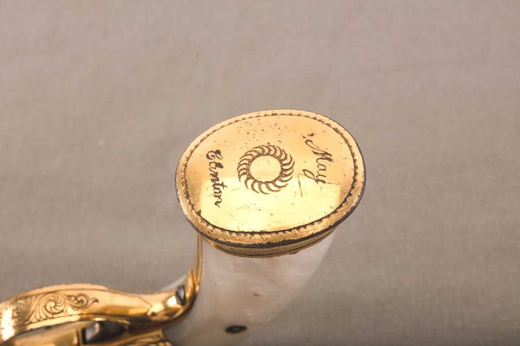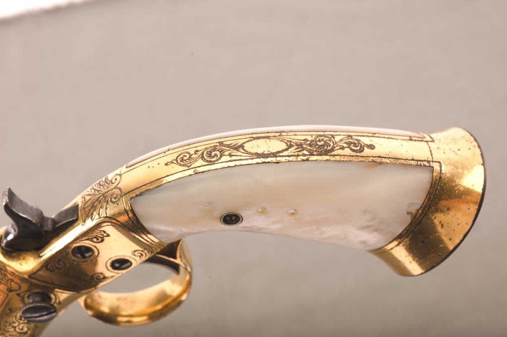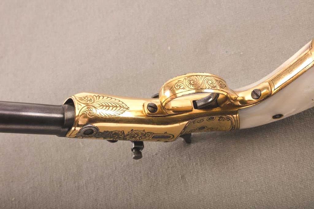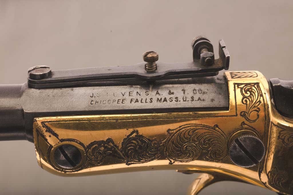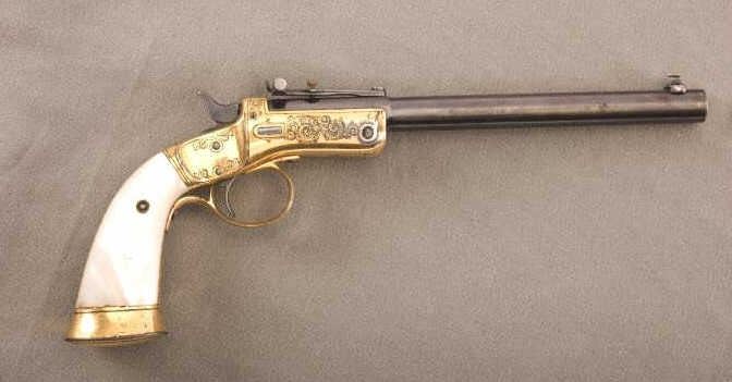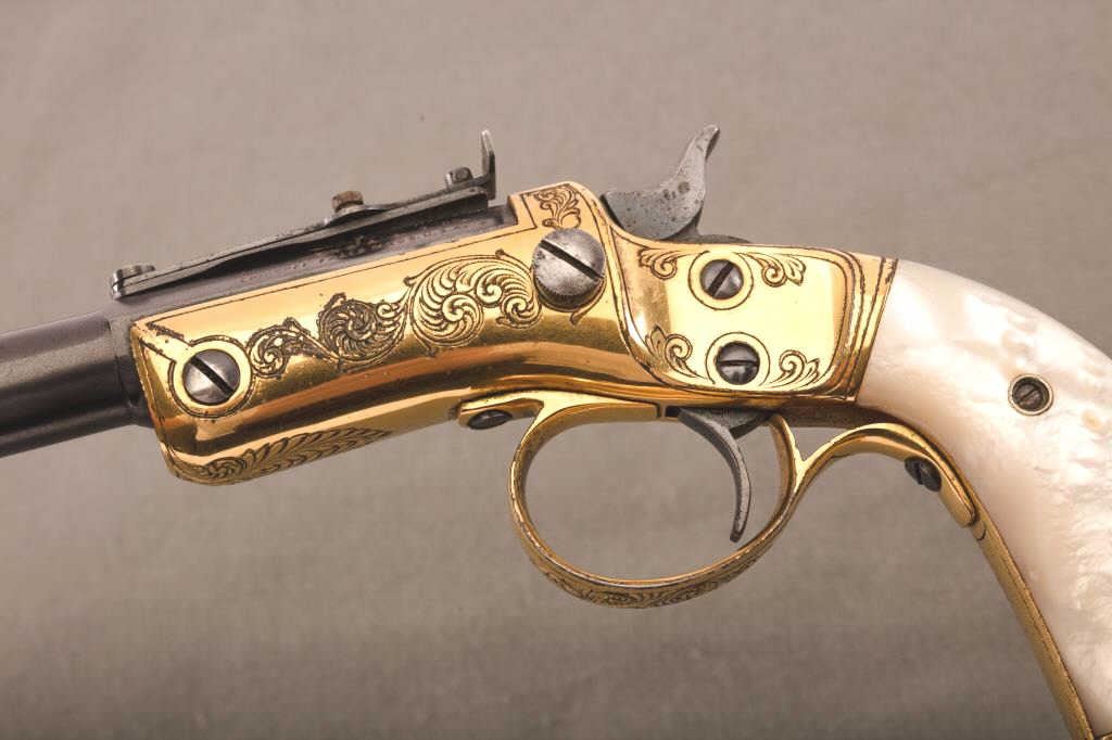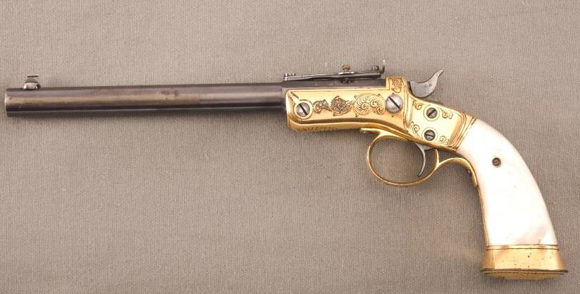 Stevens Conlin type .22 Tip-Up Target Pistol period engraved with rich gold and blue finish, pearl grips and inscribed on butt “May C Anton” or “Canton”. 8” half round/half octagon barrel, S/N 19145. Unusualadjustable for windage target type rear sight and match high bead front sight. Near fine condition with 80%-90% blue turning plum on barrel, 90%-95% toning rich gold plating, fine original pearl showing one small chip to bottom left grips. Bright bore with most original finish on small parts and screws. Very reminiscent of fold Stevens known to have belonged to Annie Oakley and the identity of Miss May could be as a trickshooter or Wild West performer who we could not locate. However in the 19th to early 20th century there were many shooting exhibitions in Europe that are not easily researched by computer search. A beautiful Stevens.(Antique) Est.: $4000-$8000