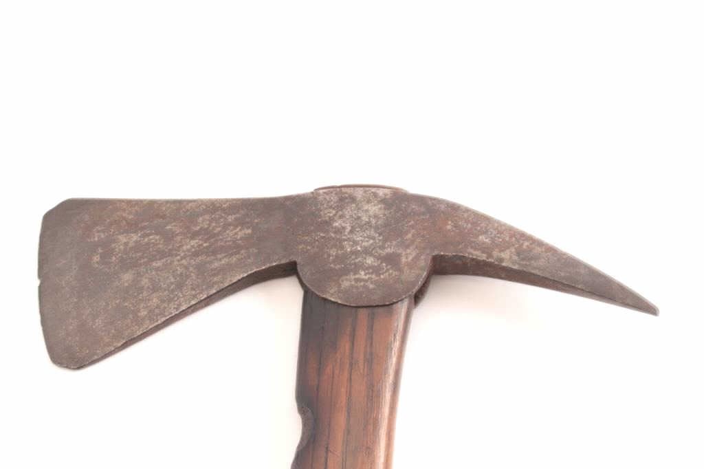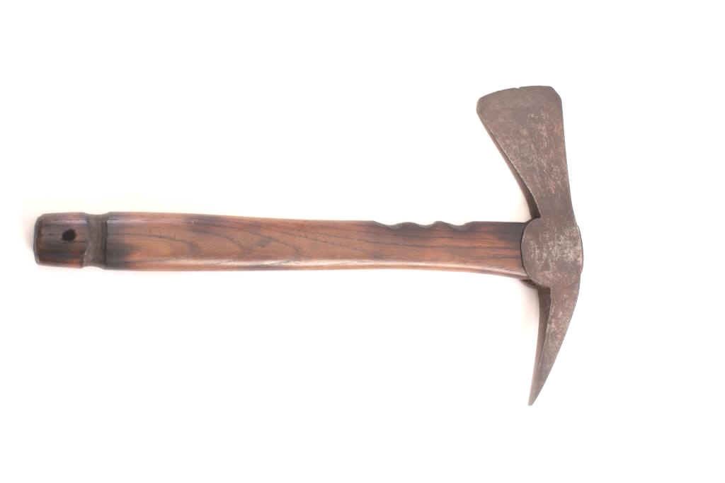 Northeast belt axe circa 1750-1790 with American wood shaft. Measures 12 ½” with head measuring 8” across. Good uncleaned patina with some pitting and erosion. American rifleman and Indians both favored these typeaxes as weapons and tools useful in the woods. From a major eastern collector. Est.: $2500-$5000