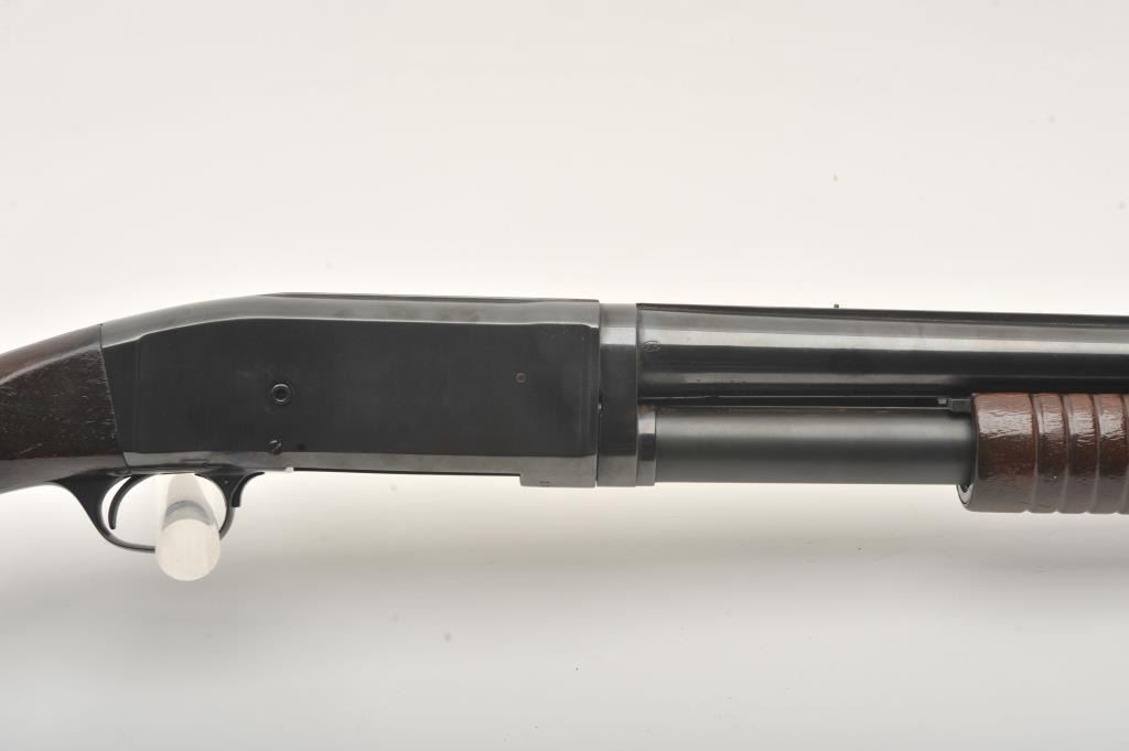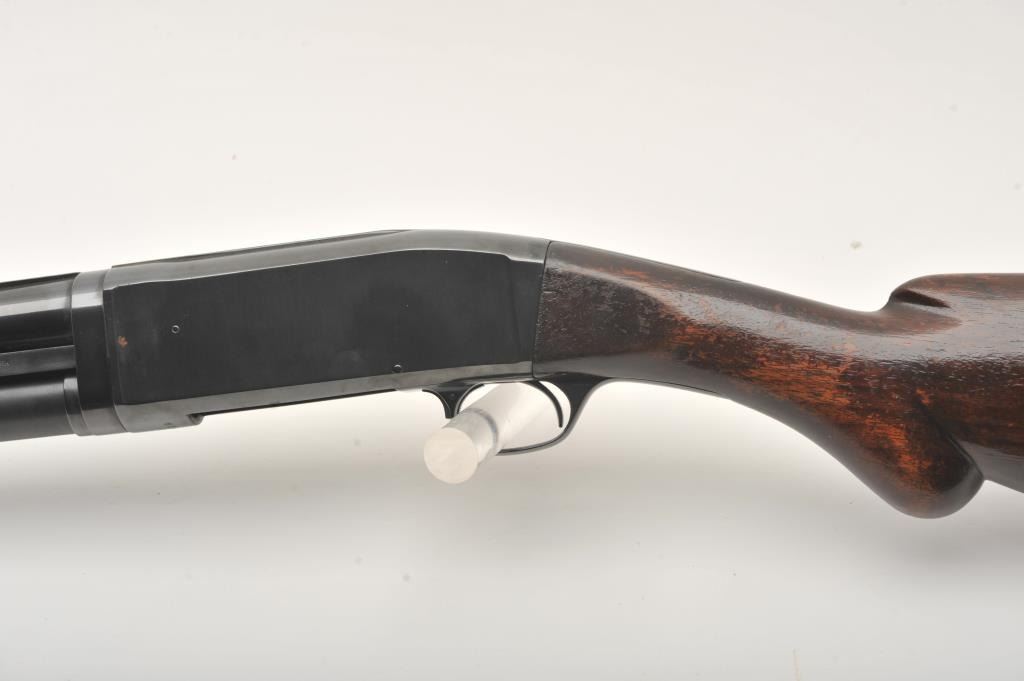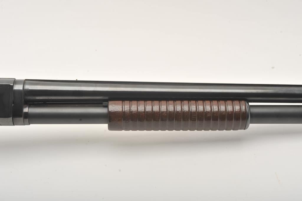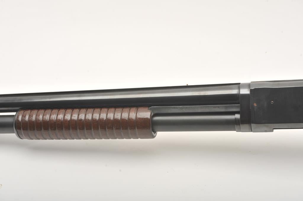 Remington Model 10 pump shotgun, 12 gauge, serial #113919. The shotgun is in very good overall condition with a 32” barrel with a brass bead front sight and full-length filed rib. The metal surfaces retain the majority of their blue finish with areas of light to moderate surface rust along the barrel. The smooth wood stocks are in good condition with scratches and mars from field use. The butt stock has been shortened and ends with a red rubber recoil pad providing a 13” LOP. The bore is good, the action is crisp and markings are sharp. Est.: $200-$400. (Modern).