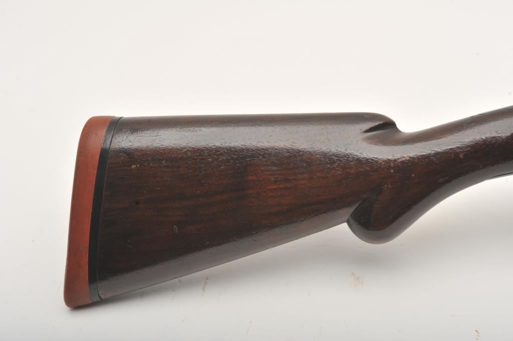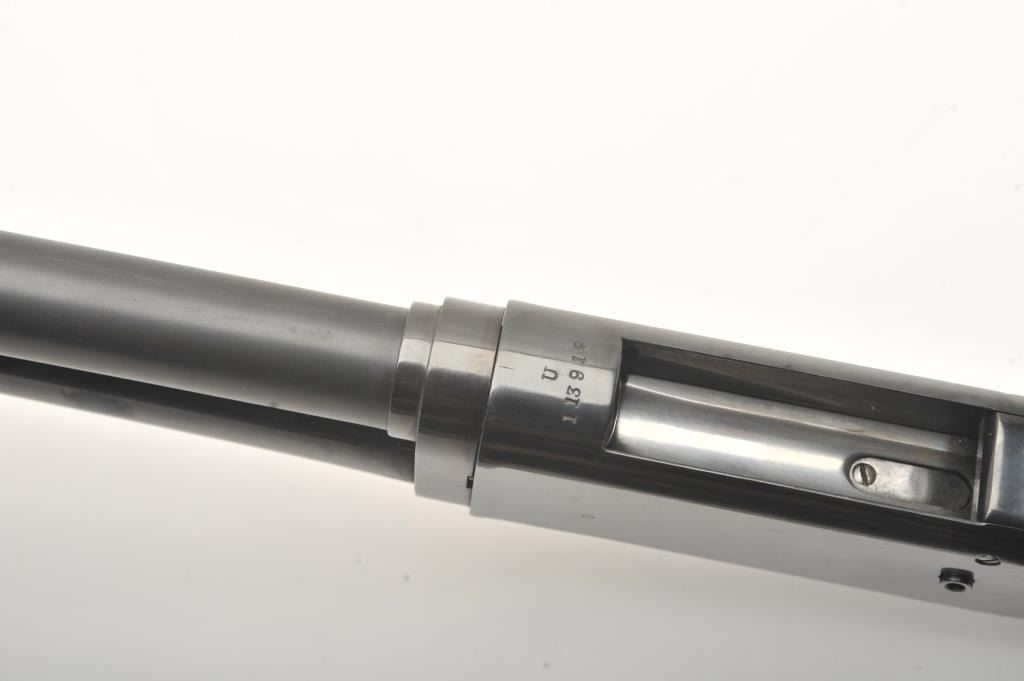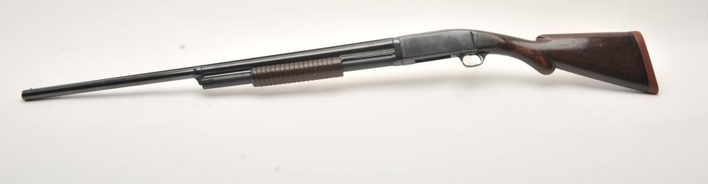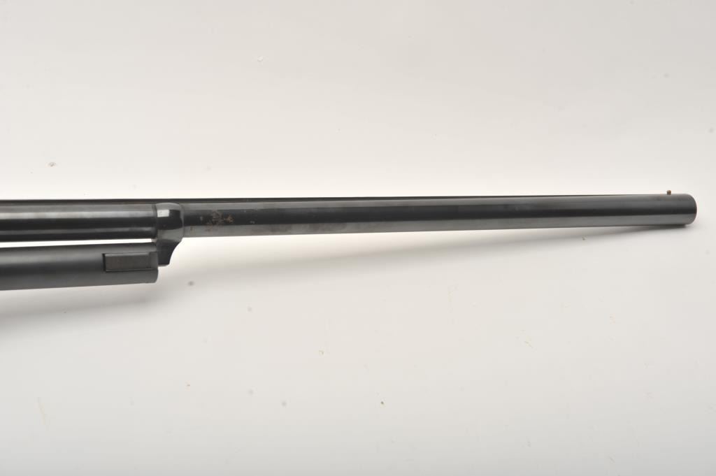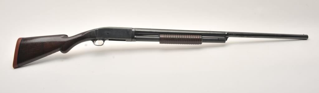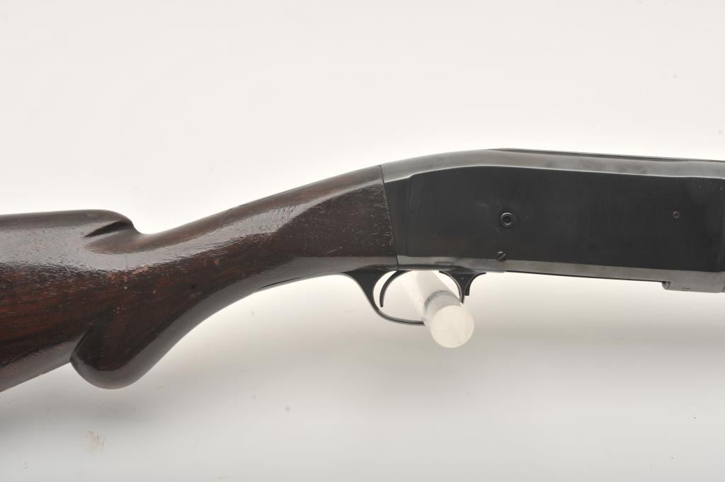 Remington Model 10 pump shotgun, 12 gauge, serial #113919. The shotgun is in very good overall condition with a 32” barrel with a brass bead front sight and full-length filed rib. The metal surfaces retain the majority of their blue finish with areas of light to moderate surface rust along the barrel. The smooth wood stocks are in good condition with scratches and mars from field use. The butt stock has been shortened and ends with a red rubber recoil pad providing a 13” LOP. The bore is good, the action is crisp and markings are sharp. Est.: $200-$400. (Modern).