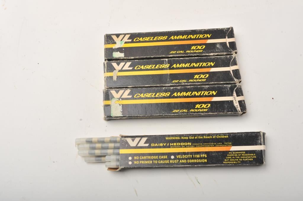 Lot of four boxes Daisy Heddon VL caseless ammunition. All four boxes are in good overall condition with 100 rounds per box, 400 rounds total. Est.: $100-$200.