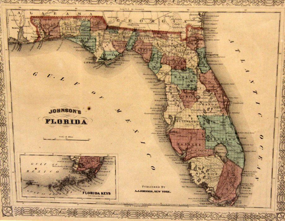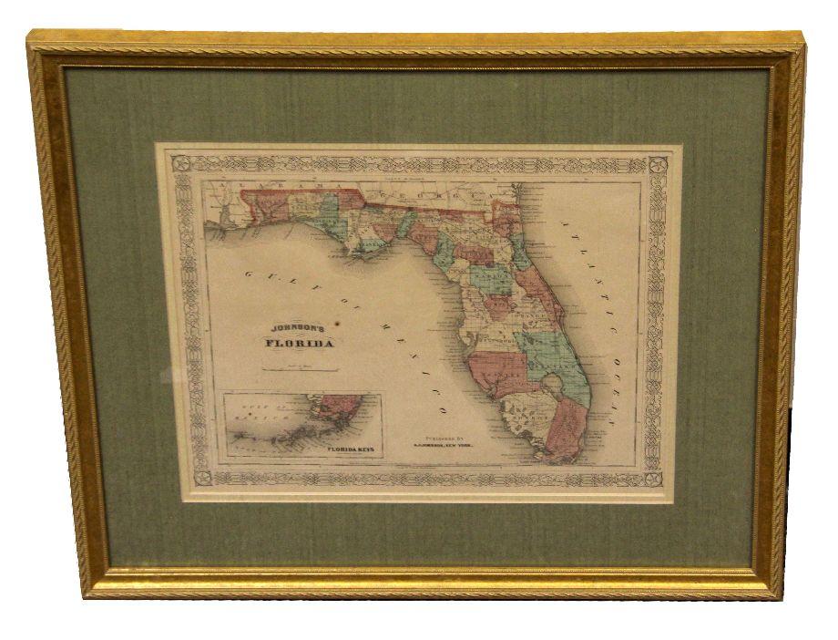 Mid to late 19th C. 23x20 inches framed. Image size 15x12 inches. Antique map of the state of Florida published by A.J. Johnson, New York with vivid color. Very good condition.