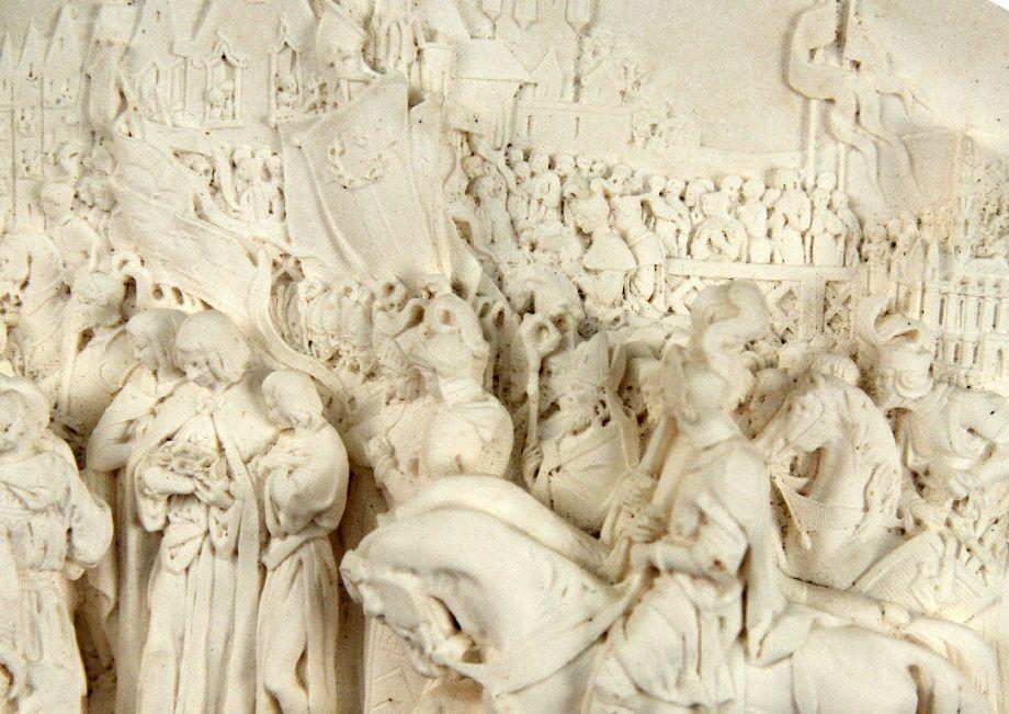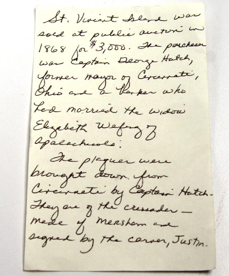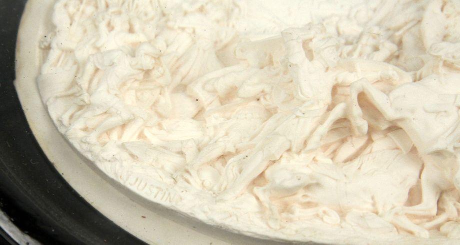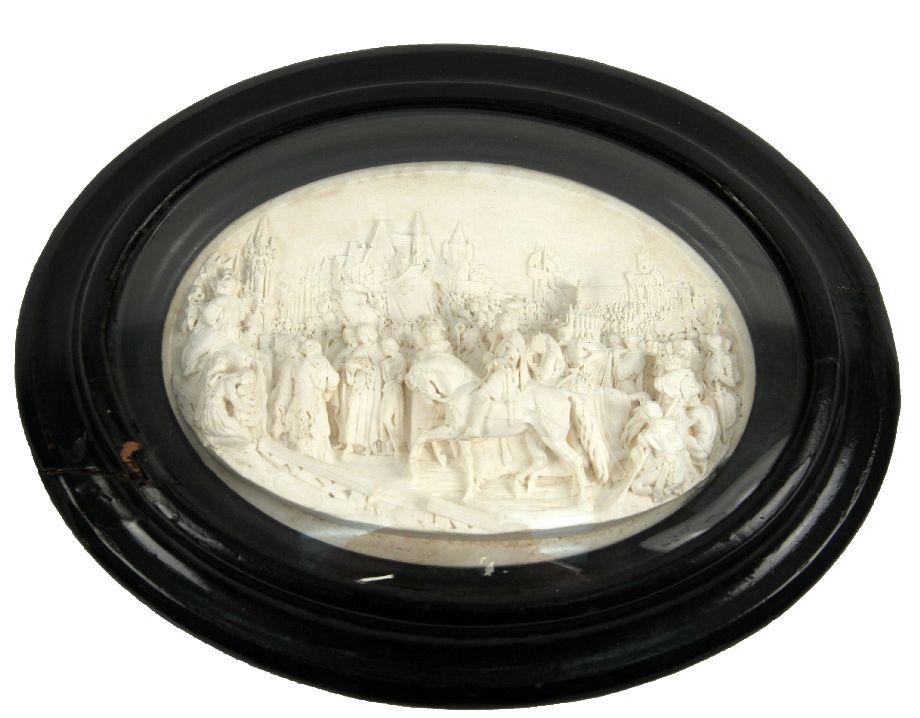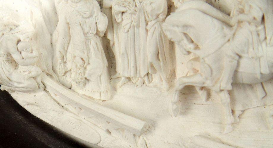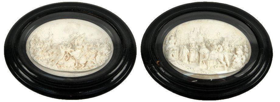 19th C. 10 inch oval plaques in black frames depicting scenes from the Crusades in intricately carved meerschaum. Both pieces are signed by the artist Mathieu Justin on front and reverse. Includes hand -written provenance from previous owner detailing the items purchase in 1868 by former mayor of Cincinnati, George Hatch. Overall very good condition with some losses to one of the frames.