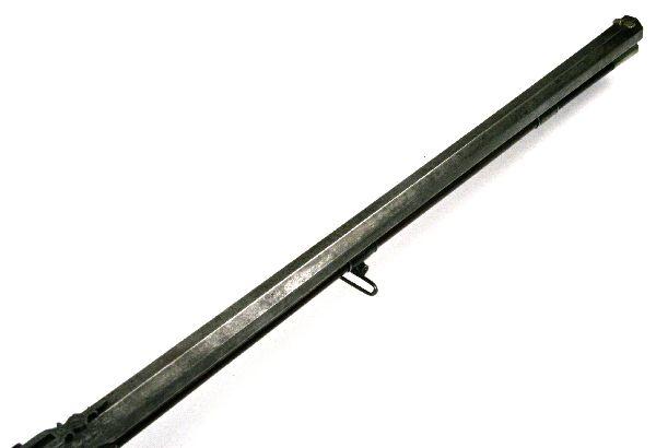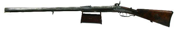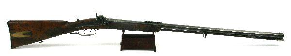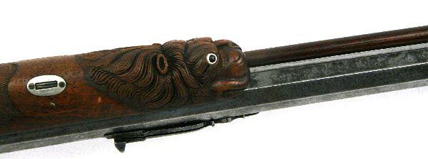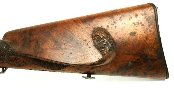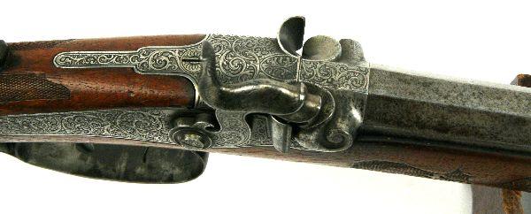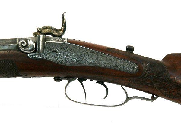 Ornately engraved percussion rifle, with highly detailed, hand carved stock. Lock plate, tang, and trigger guard finely engraved with scrolling and floral design, while lock itself engraved to figure of a fish. Walnut stock, with floral scroll, checkering, and two figural lion's heads carved into wood with great detail. Gun is maker marked "BURCKHARDT" on lock plate. Octagonal barrel, 50 caliber, with double set triggers, and brass patch box on back of butt. Additional lions head carved into rear of cheek rest. Good patina over surface of metal, and stock is in very good condition, with some aged handling marks. Overall very good condition.