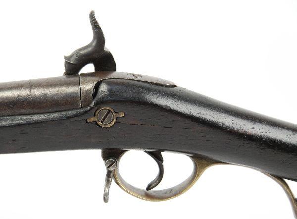 Scarce Royal Nepalese copy of a British Brunswick rifle. About 12000 of these were hand made in Nepal between 1840, and 1860. This example is one of the heavier versions that more closely resembled the British made Brunswick rifles. 30 inch barrel, with caplock (percussion) firing mechanism, side mounted bayonet lug, and twin groove rifling for banded ball. Brass trigger guard, with Nepalese markings underneath. Brass butt plate and patch box. Dark patina on both wood and metal surfaces. Ramrod appears original. .704 caliber bore is dusty and dirty from age, but appears sound and cleanable. Firing mechanism feels strong, and latching mechanism on patch box cover works good. Overall very good condition for the age. Caliber: .704
