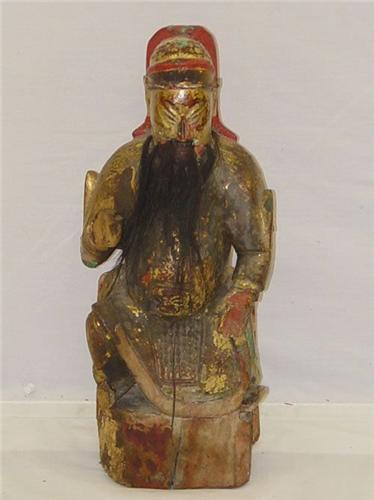 19TH CENT. 16 1/4" CARVED & PAINTED WOODEN CHINESE ALTAR FIGURE W/ HORSE HAIR BEARD - LOSSES TO WOOD & PAINT, IMPERFECTIONS
