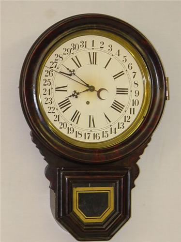 19TH CENT. 24" E. INGRAHAM DEW DROP CALENDAR CLOCK W/ FAUX TORTOISE SHELL DECORATION (PAINTING) - LOSSES & IMPERFECTIONS