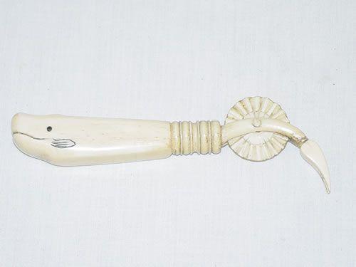 19TH CENT. 5 1/2" CARVED IVORY WHALE FORM PIE CRIMPER (JAGGING WHEEL) - LINES IN HANDLE, OLD BREAK REPAIR TO JAGGING WHEEL BRACKET