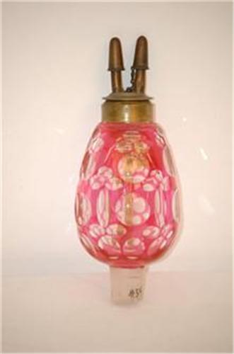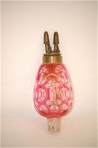 19TH CENT. 6 3/4" CUT OVERLAY PEG LAMP-CRANBERRY CUT TO CLEAR W/ BRASS DOUBLE WHALE BURNER FITTINGS W/ CAPS (PROBABLY SANDWICH) - CHIP TO PEG, WEAR & IMPERFECTIONS