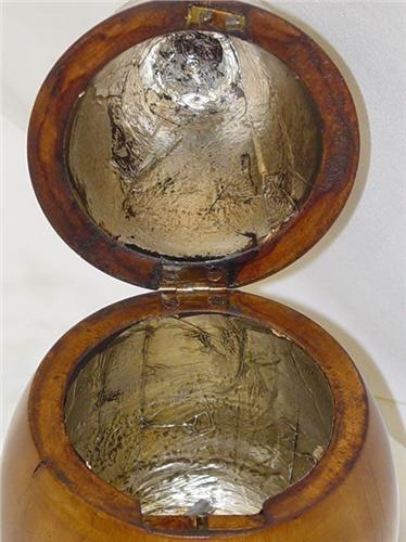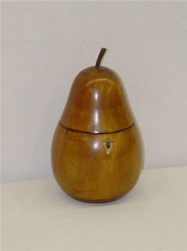 19TH CENT. 7 1/2" FRUITWOOD PEAR FORM TEA CADDY W/ IVORY ESCUTCHEON, KEY, & OLD LINER (PROBABLY ENGLISH) - NORMAL WEAR, IMPERFECTIONS