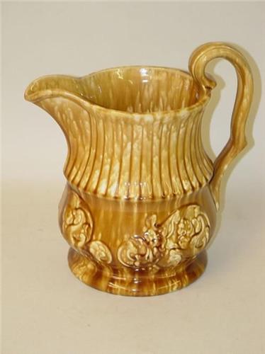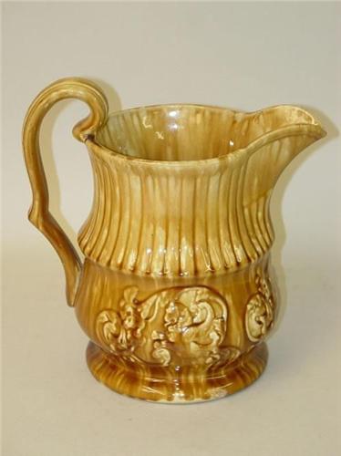 19TH CENT. BENNINGTON TYPE RELIEF MOLDED MILK PITCHER W/ SHAPED HANDLE, RIBBED COLLAR & FOLIATE DEVICES W/ WINGED GRIFFINS (10 1/2" T X 10" W WITH HANDLE) - WEAR, GLAZE CRAZING & IMPERFECTIONS