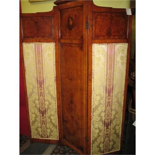 A FABULOUS ENGLISH 19TH CENTURY BURR WALNUT 3 SECTION SCREEN, INLAID WITH SATINWOOD AND EBONY WITH A FLOWER DESIGN TO THE CENTER PANEL. THE SCREEN HAS BEEN RECENTLY RE-UPHOLSTERED IN A FINE FABRIC ON BOTH SIDES OF THE TWO END PANELS AND FINISHED WITH DOUBLE PIPING. THIS IS A VERY RARE AND UNUSUAL SCREEN AND IS IN VERY GOOD CONDITION. IT WAS MADE CA 1850. THE CENTER SECTION OF THE SCREEN IS HIGHER THAN THE OTHER TWO PANELS AND HAS NICELY MOLDED DETAIL TO THE TOP EDGE.