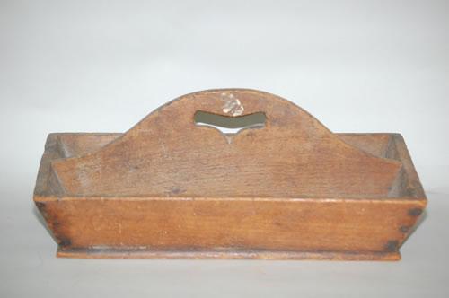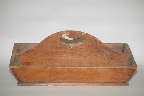 19TH CENT. CARVED CUTLERY TRAY - WALNUT DIVIDED CUTLERY TRAY W/ CANTED SIDES & ARCHED HANDLE W/ STYLIZED HEART SHAPED CUT-OUT CARVED HAND GRIP (6" T X 16" L X 9" W) - WEAR, SOILING, IMPERFECTIONS