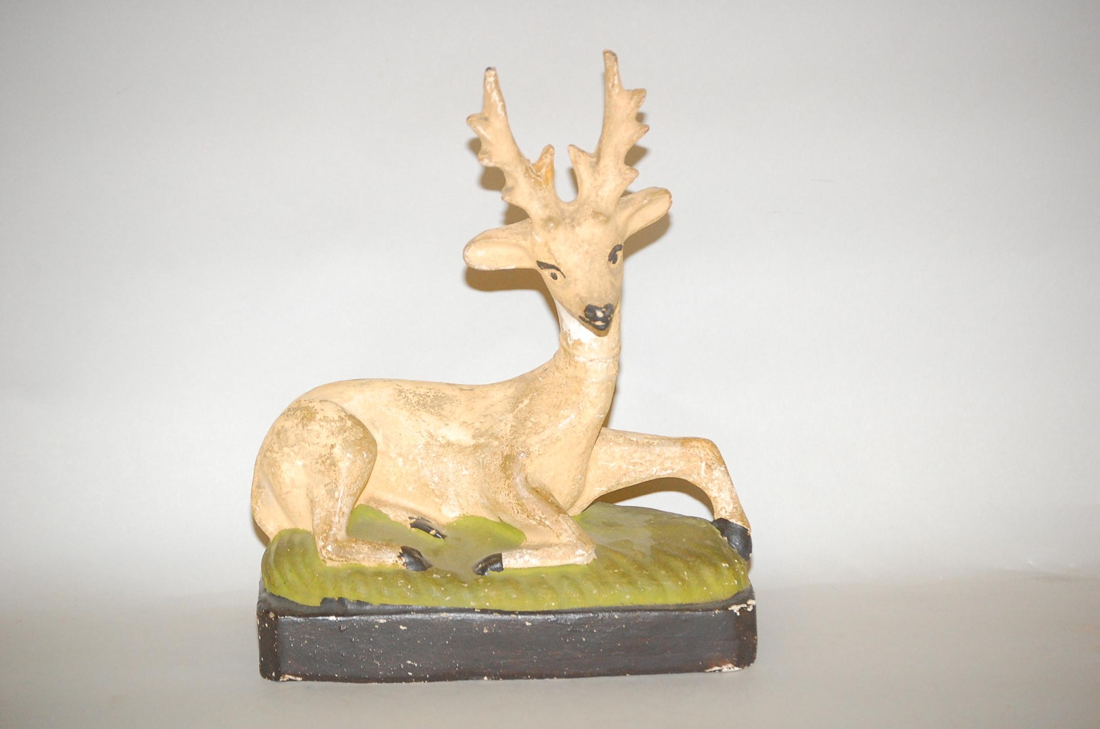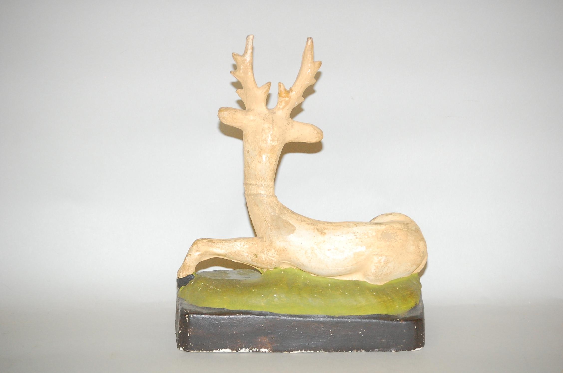 19TH CENT. CHALKWARE DEER FIGURINE - MOLDED CHALKWARE RECUMBENT STAG FIGURINE ON A MOUNDED LAWN & SQUARE BASE IN POLYCHROME PAINT (10 1/4" T X 9" W X 3 1/2" D) WEAR, PAINT LOSS, REPAIR, IMPERFECTIONS