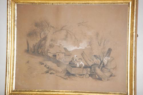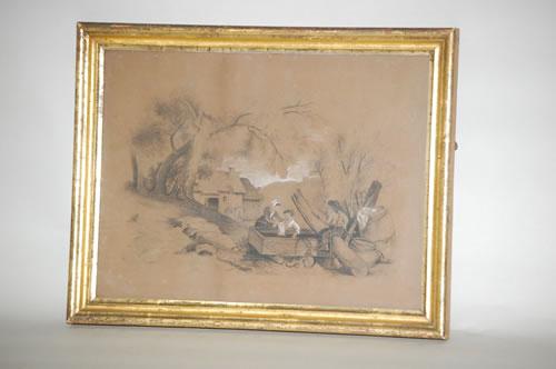 19TH CENT. CHARCOAL LANDSCAPE DRAWING - SMALL 19TH CENT. CONTINENTAL CHARCOAL LANDSCAPE GENRE SCENE W/ THATCHED COTTAGE & PEASANT FAMILY DRAWING WATER AT TROUGH-UNSIGNED IN A LEMON GOLD FRAME (10 1/4" X 13 3/4") - WEAR, TONING, IMPERFECTIONS