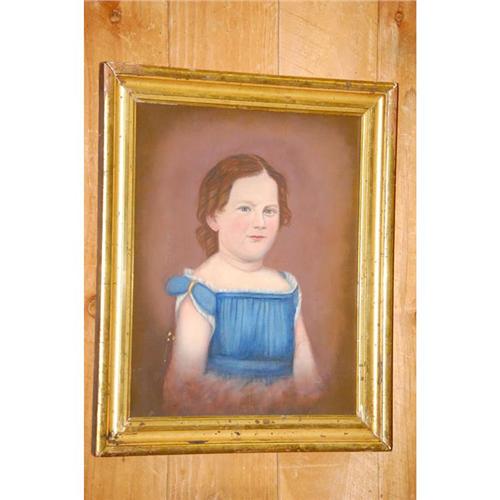19TH CENT. CHILDS PORTRAIT PAINTING - OIL ON CANVAS OF GIRL IN A BLUE DRESS W/ ROSY CHEEKS IN A GILT PLASTER MOLDED FRAME (21 1/4" X 17") - WEAR, CRAQUELURE, LOSSES & REPAIRS, IMPERFECTIONS